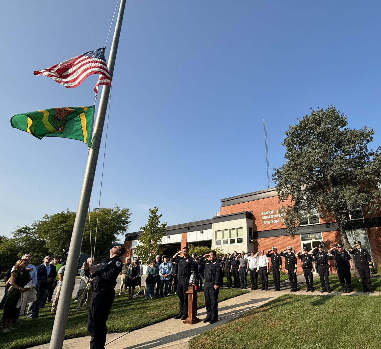Ceremonies will take place at the flagpole of all three Skokie Fire stations beginning at 8:57 a.m. At 8:59 a.m. (time of the World Trade Center South Tower collapse), a “last alarm” bell ceremony will take place followed by a minute of silence at 9 a.m.