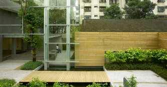 波浪形雕塑交錯疊置,植以樹蘭,視覺隔絕後巷,打 上燈光及自動灑水裝置,不論由建築內外,四面八方