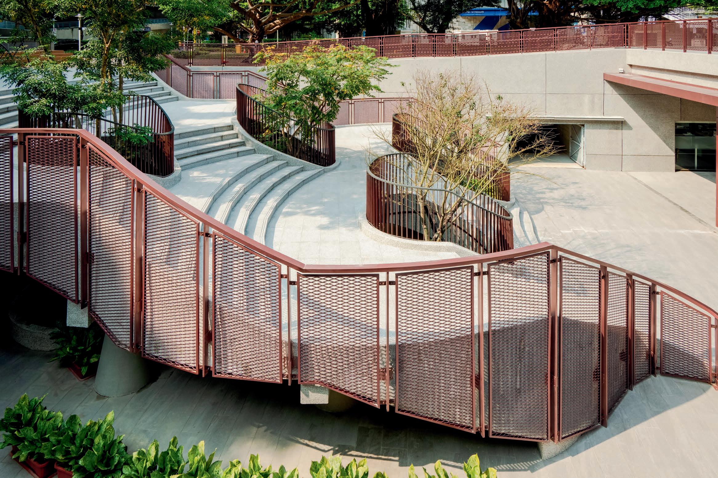 及大型鋼板字打造了一面線型景觀牆,如一道含蓄的 邀請。「未來這個地方會整個綠起來,融入到原有的