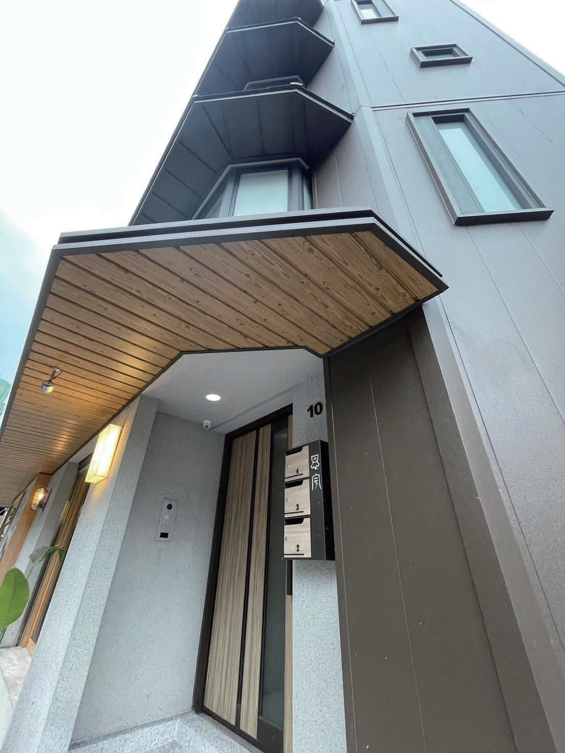 屋頂的違建部分經過修繕處 理,並以同色系塗料噴塗,避 免突兀的視覺效果。所有外部管線整齊收納在建 物背面,保證建物正面的整潔美觀。