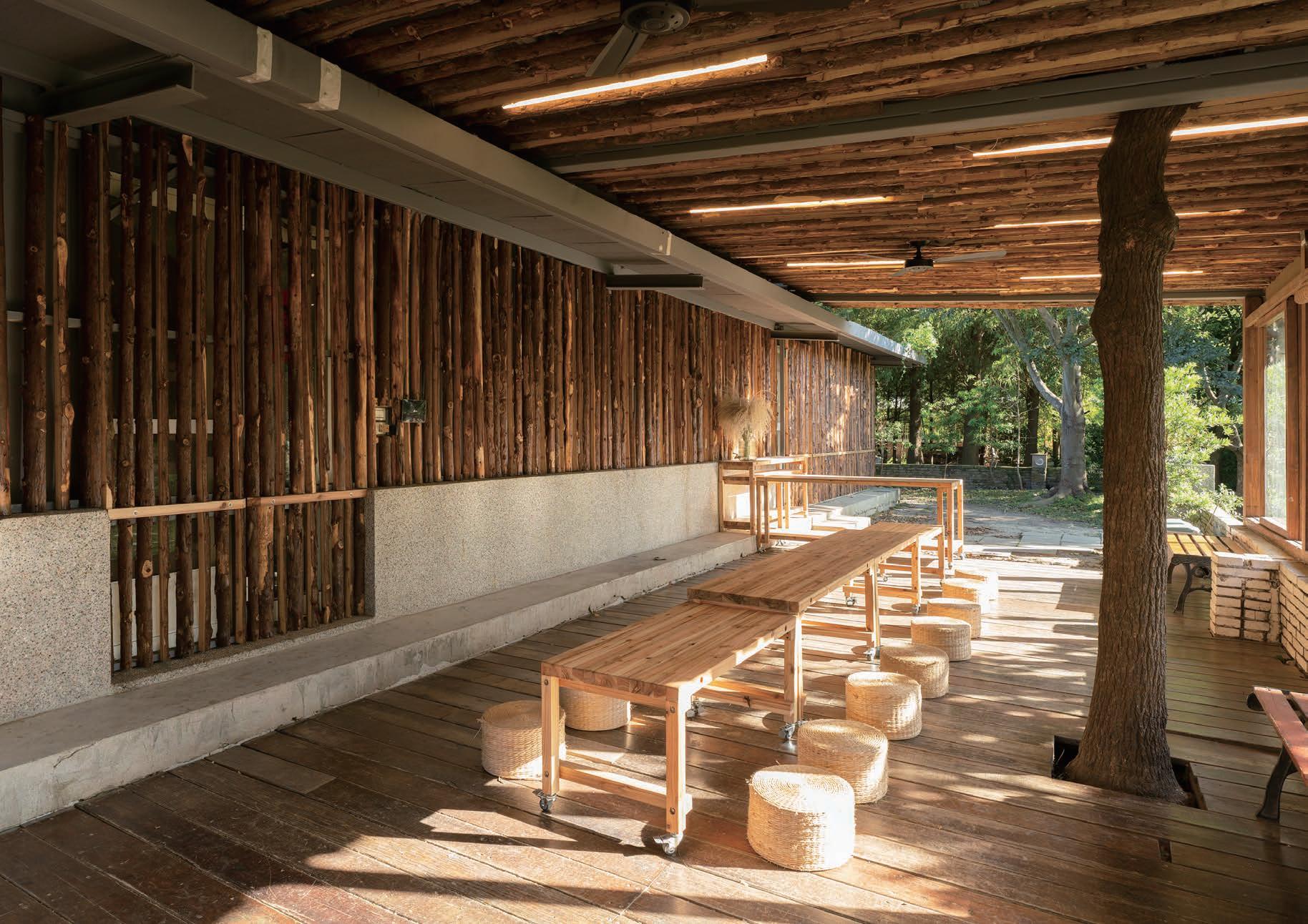 延續著室內外景色的聯繫,在進入建築的動線上,團 隊利用人造木質地坪、活動式遮陽棚創造樹下休憩的 空間。在原有的造型鋼架上,以藤蔓植物、透空鐵 網