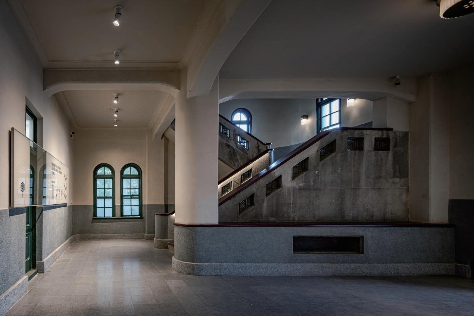 電梯增建後,為避免樓梯間變暗,特 別在西側新增氣窗,保持樓梯間的通 風與自然光。樓梯間也重新鋪設木質橡膠地坪, 更新整體視覺效果。
