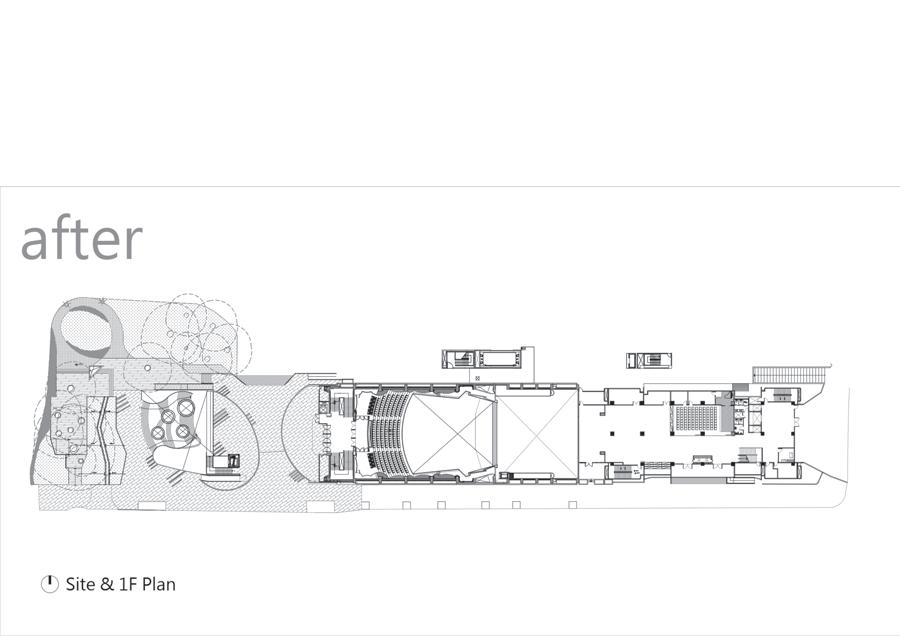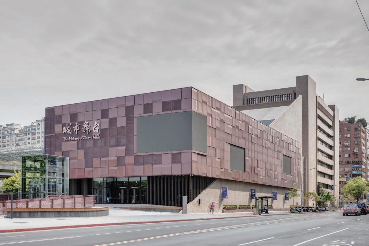 舊的遮雨棚,讓外部的自然景色與 光線可以更流暢地進入室內,建築的二層樓高斜向鋁 板造型進一步放大這樣的效果,使室內外空間有了無 縫的視覺延續。