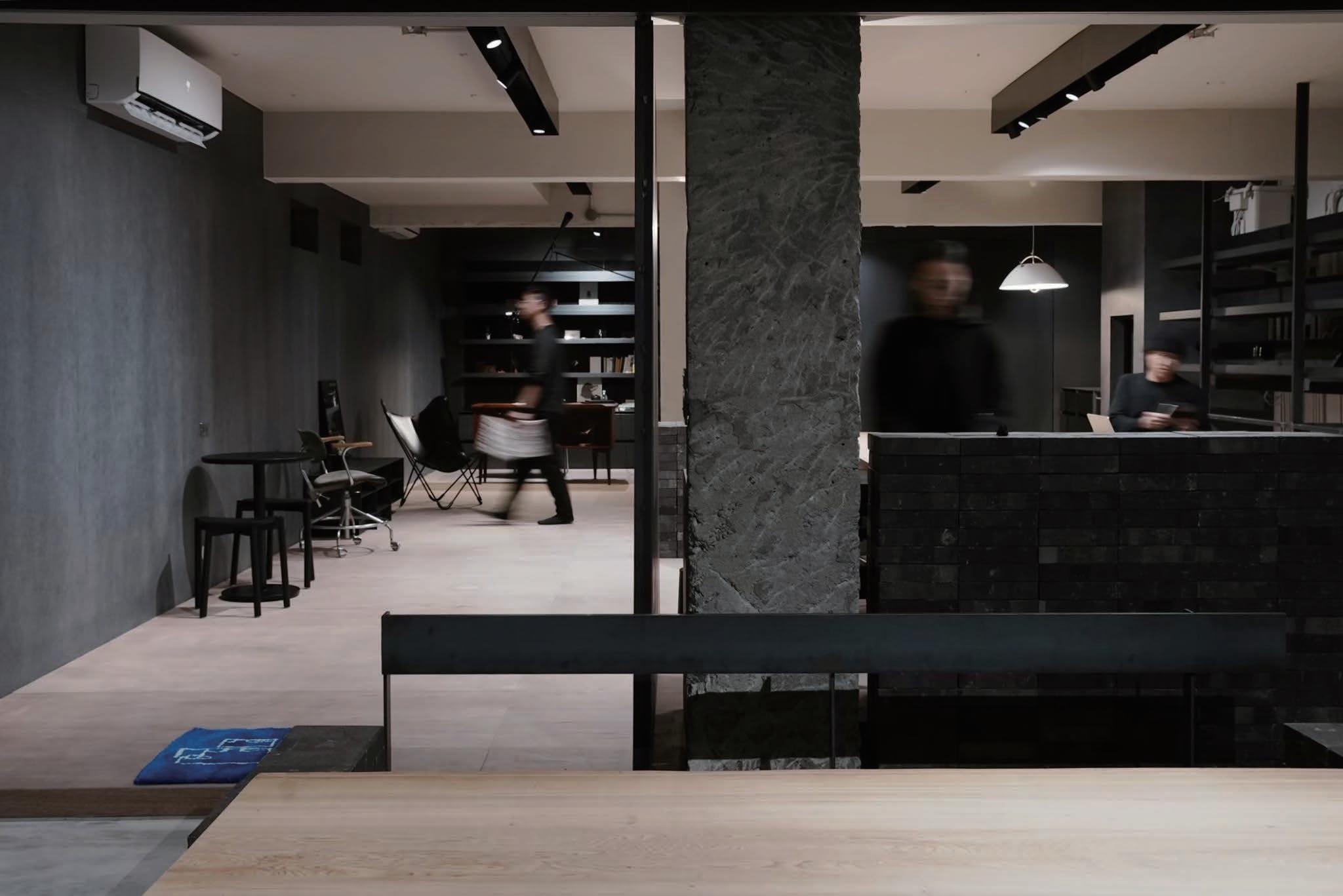 空間設計運用了實木、金屬、 水泥等原材料,並搭配黑色基 調,與溫暖的木質元素交織出強烈的反差感,呈現 出低調而專注的空間個性。設計團隊一日一土的風 格強調簡約而不失質感,這些材料的運用不僅增加 了空間的層次感,也使其具備視覺上的獨特性。