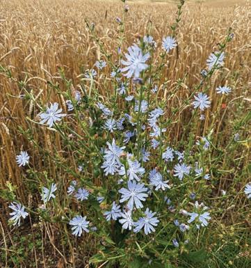 as we pass along an overgrown track; being serenaded by birds that dart between trees but are hidden by summer foliage; the distant tapping of a woodpecker; the wheeling and ‘mewing’ of red kites overhead; the chomping of sheep in a pasture, and sudden trotting of hooves as they make way for us; the swathes of rippling blue chicory or phacelia around field margins, reminding us of the sea; the contrast of brilliant red poppies against the gold of ripened wheat; garlands of bright berries of late, adorning the hedgerows and woodland; white, fluffy clouds