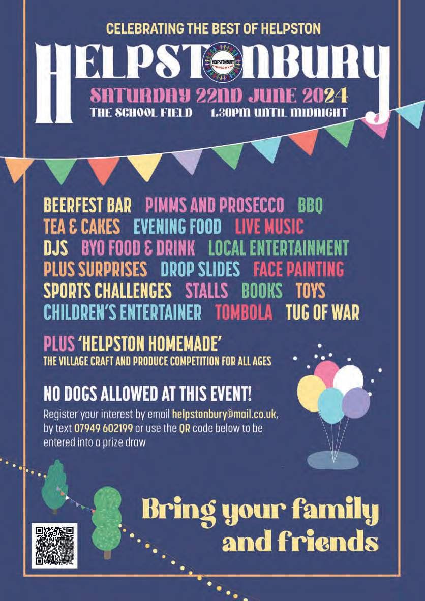 Elsewhere in this edition, you will have read about plans for a new Village Hall in Helpston. As part of the fundraising for this major project, the Helpston and Etton Community Association are running a Silent Auction ending at 7.00pm on Saturday 22 June at the Helpstonbury Festival. There are over 60 ‘lots’ going under the hammer – head along to www.jumblebee.co.uk/helpstonburysilentauction2024 to place your bids