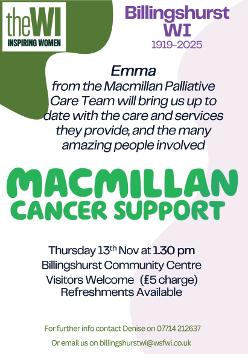 13 Nov Billingshurst WI Talk: Emma from Macmillan Palliative Care talking about the care they provide. Community Centre, Roman Way. 1.30pm. WI members enjoy interesting speakers, making new friends and socialising in each other’s company. Visitors welcome, £5. Tel: (01403) 257531