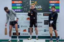 Top: the first three in the men’s half marathon, left to right: Thomas Thayre (3rd) Sam Cook (1st) and Jake Forrest (3rd). Centre: the start of the half marathon. Bottom: the Kids Colour Fun Run. Photos: Dan Stockwell