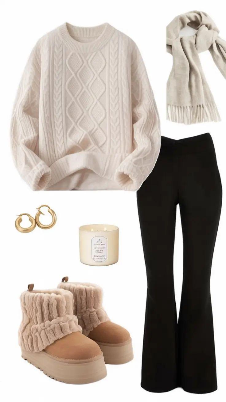 This outfit is chic and practical. The cable-knit cream sweater and black flared le in saddacom ortable-yet-sleeklookto your silhouette. This outfit will make you looklikeyoumadenoe ort,butstilllookso stylish. The scar adds a texture that makes thelookstyledyetnotoverthetop.