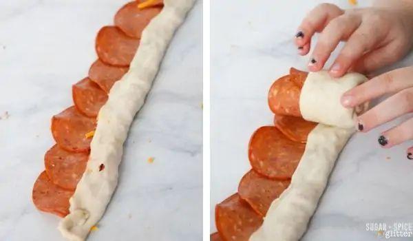 Roll your dou h out flat in a rectan le shape. Use a pizza cutter or kni e to cut dou h into strips about 1.5” wide. For each individual strip, lay slices o cheese on top across the entirestripo dou h.Placealineo pizzasauce over all o the cheese. Place the pepperoni slices across the entire len th o the strip so that hal o the slice is on the dou h while the other hal is han in o . It should look similar tothis: