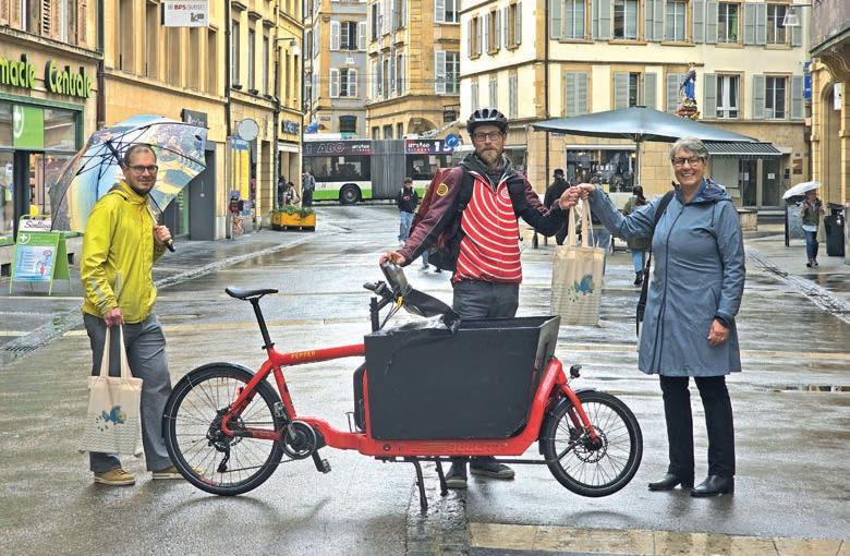 Faire ses achats en ville sans recours à la voiture, c’est allier le plaisir à la liberté… à condition de ne pas avoir des kilos à porter, surtout si l’on habite un 3e étage sans ascenseur ! C’est pourquoi depuis 2016, la Ville de Neuchâtel soutient le service Dring Dring de livraison à vélo. Au vu du succès rencontré – environ 1000 livraisons par an dans le périmètre de l’ancienne ville – le rayon d’action des coursières et coursiers de la Cyclone s’étend désormais à Peseux et Corcelles-Cormondrèche. « Avec ce service étendu, nous désirons renforcer l’attractivité des commerces locaux, notamment auprès des personnes âgées ou à mobilité réduite ou des familles avec enfants en bas âge, et rendre notre commune vivante et animée, tout en soutenant une o re de livraison entièrement décarbonnée », explique Johanna Lott Fischer, conseillère communale en charge du développement durable, de la mobilité et de la sécurité. Les personnes domiciliées dans les localités ayant le code postal 2000, 2034, 2035 et 2036 peuvent donc dès à présent se faire livrer à domi-