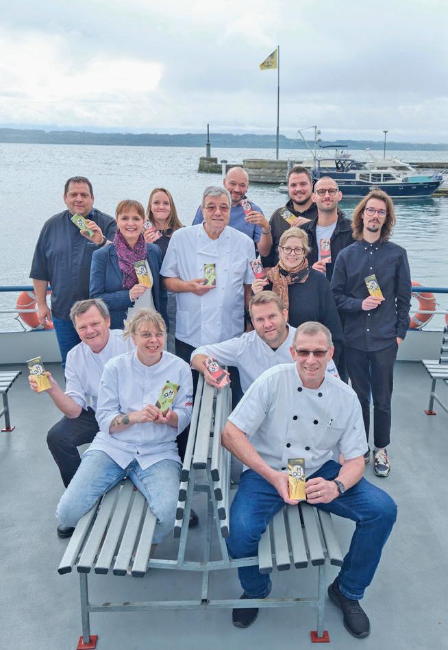 Réunis à bord du Ville de Neuchâtel, les pros de la confiserie-chocolaterie sont prêt-e-s à lancer la manifestation. Au centre, la conseillère communale Violaine Blétry-de Montmollin, le président de Chocolatissimo Pierre Walder, et la coordinatrice de l’événement, Eva Volery.