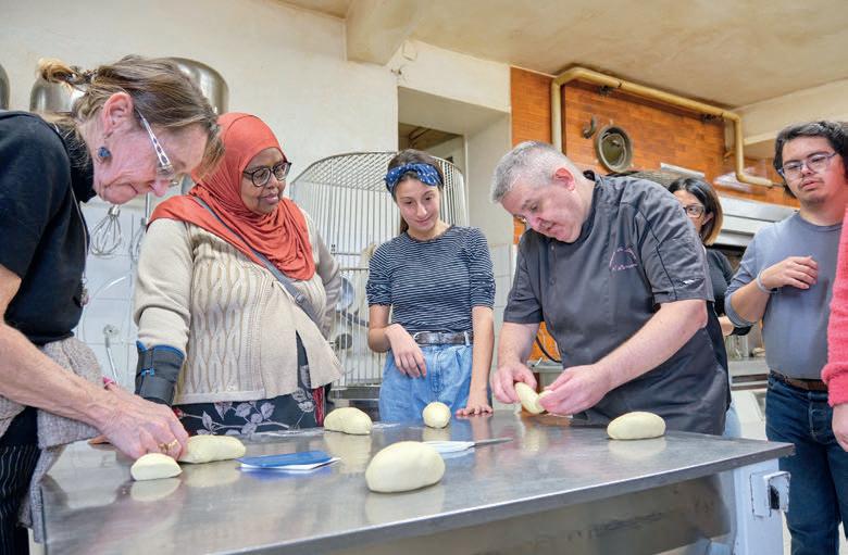 Avant de passer à la confection, passage obligatoire au lavabo pour se laver les mains. « J’ai aussi attaché mes cheveux », relève une participante, fine prête à mettre la main à la pâte. Le boulanger Nicolas Perriard et sa femme Marie enca drent la joyeuse équipe avec beaucoup de bien veillance. Le maître des lieux a sorti la pâte et montre à chacun-e comment s’y prendre pour donner forme à leurs créations. Raisins et noisettes servent à apporter une touche de décoration finale. Très appliqués, les ouvriers du jour mettent du cœur à l’ouvrage : une dame tresse une écharpe, pendant que son voisin modèle jaquette et bonnet pour que son bonhomme ne prenne pas froid. « Oh regarde, on dirait Casi mir ! », s’exclame une femme au moment de dé couvrir les bonshommes sur les plaques. Les créations sont dorées et placées au four, où elles lèveront, avant de cuire pendant une vingtaine de minutes. Pour patienter, les partici pant-e-s discutent autour du verre de l’amitié, tout en dégustant quelques spécialités de la Tar terie du Littoral. « Nous sommes heureux d’aider à notre manière des personnes qui sont trop sou vent laissées en dehors du chemin », relève Nicolas Perriard. A l’origine, l’action Tous de la même pâte ! a vu le jour au marché de Noël de Glaris en 2019. Neuchâtel y participe chaque année depuis 2020. ● AK