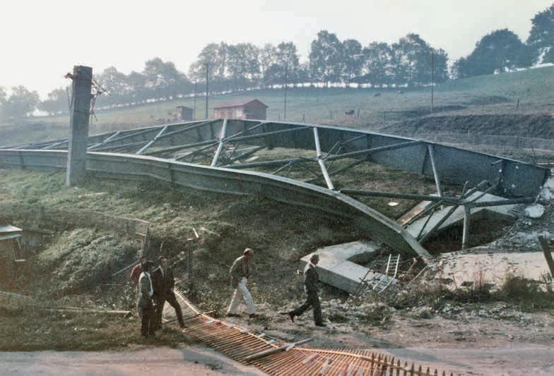 Deux ans après la catastrophe, les travaux du nouvel ouvrage arrivent à leur terme, comme le détaille L’Impartial du 18 septembre 1975 : « Le viaduc de Valangin reçoit ces jours-ci son tapis définitif, revêtement qui contient notamment un produit antigel qui a fait ses preuves dans le canton du Valais. Profitant du temps clément, les responsables font mettre les bouchées doubles aux ouvriers et l’activité est assez spectaculaire. » Et de rappeler : « Le 30 septembre, quatre chars d’armée, des Centurion pesant chacun 50 tonnes, passeront sur le viaduc afin d’en tester la solidité. Toutefois, lorsque l’on voit le nombre imposant de camions, grues, rouleaux compresseurs circuler sur le champ de bataille ces jours, les craintes d’une seconde catastrophe semblent superflues. » L’ensemble des ouvrages a o ciellement été ouvert à la circulation le 29 octobre 1975, au terme de travaux qui auront duré cinq ans. ● AK
