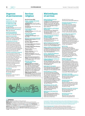 ❚ BIBLIOTHÈQUE-LUDOTHÈQUE PESTALOZZI (Faubourg du Lac 1, Neuchâtel), du ma au ve 13h30-17h30. Fermeture lu 28 fév. et ma 1er mars. Tél 032 725 10 00. www.bibliotheque-pestalozzi.ch. ❚ BIBLIOMONDE BIBLIOTHÈQUE INTERCULTURELLE ET MULTILINGUE (Rue de la Treille 5, Neuchâtel), lu, me, je et ve 14h-17h, ma 9h-11h/14h-17h, sa 10h-12h. www.bibliomonde.ch. ❚ BIBLIOTHÈQUE ADULTE PESEUX (Rue du Temple 1A), ma 9h-12h, me et je 17h-19h. Fermeture lu 28 fév et ma 1er mars. Tél 032 886 59 30. ❚ BIBLIOTHÈQUE JEUNESSE PESEUX (Collège des Coteaux, rue du Lac 3), lu 13h30-17h, ma et je 14h-17h, me 8h-10h20/13h30-17h, ve 8h-12h. Fermeture du lu 28 février au ven 4 mars. Tél 032 886 40 61. ❚ COD – CENTRE ŒCUMÉNIQUE DE DOCUMENTATION (Grand’Rue 5A, Peseux) lu et me 14h -17h30; ma, je et ve 9h-11h30. Tél 032 724 52 80. www.cod-ne.ch. ❚ BIBLIOTHÈQUE DE CORCELLESCORMONDRÈCHE (Avenue Soguel 27), lu 9h-12h15 / 13h-15h, ma 15h15-19h, me 14h-18h, ve 13h30-16h30. Fermeture du lu 28 février au ven 4 mars. Tél 032 886 53 18. ❚ BIBLIOBUS À VALANGIN (Vieux Bourg, place de la Collégiale 7), une fois par mois, prochaine date: 28 mars de 17h30 à 18h35, se renseigner sur www.bibliobus-ne.ch. ❚ PATINOIRES DU LITTORAL horaires d’ouverture au public, du me 9 au di 13 : Me 9 patinage 9h-11 h30/13 h30-16h15 et hockey 13 h30 -16h15; Je 10 et ve 11 patinage 9h-11 h30/13 h45-16h15 et hockey 13 h45-16h15; Sa 12 matin fermé, patinage 13 h4516h30; Di 13 patinage 9h-11 h45/ 13 h45-16h30 et hockey 12 h-13 h30. La patinoire sera fermée du di 13 à 16h30 jusqu’en automne. www.lessports.ch/patinoires. Tél. 032 717 85 53. ❚ PISCINES DU NID-DU-CRÔ Bassins intérieurs, horaires tout public: lu au je 8h-22h, ve 8h19h30, sa 8h-18h30, di 9h-19h. www.lessports.ch/piscines. Tél. 032 717 85 00. ❚ BOUTIQUE D’INFORMATION SOCIALE (Rue St-Maurice 4, Neuchâtel), pour toutes questions à caractère social. Ouverture du lu au ve, 8h30- 12h et 13h30-17h, ma 8h30-12h et 13h30-16h.