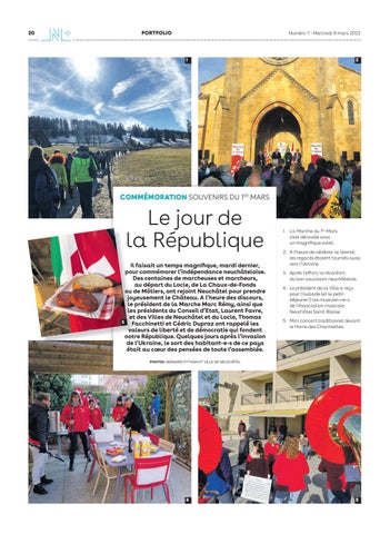 1. La Marche du 1er-Mars s’est déroulée sous un magnifique soleil. 2. A l’heure de célébrer la liberté, les regards étaient tournés aussi vers l’Ukraine. 3. Après l’effort, le réconfort : du bon saucisson neuchâtelois. 4. Le président de la Ville a reçu pour l’aubade (et le petitdéjeuner !) les musicien-ne-s de l’Association musicale Neuchâtel Saint-Blaise. 5. Mini-concert traditionnel devant le Home des Charmettes.