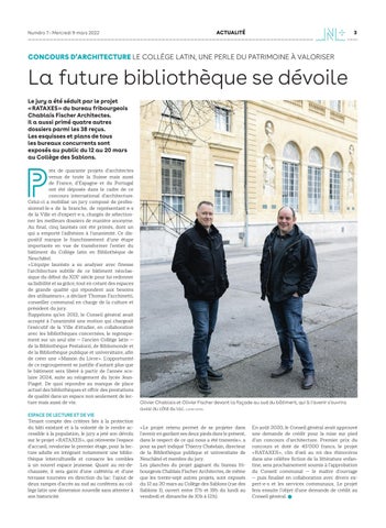 « Le projet retenu permet de se projeter dans l’avenir en gardant ses deux pieds dans le présent, dans le respect de ce qui nous a été transmis », a pour sa part indiqué Thierry Chatelain, directeur de la Bibliothèque publique et universitaire de Neuchâtel et membre du jury. Les planches du projet gagnant du bureau fribourgeois Chablais Fischer Architectes, de même que les trente-sept autres projets, sont exposés du 12 au 20 mars au Collège des Sablons (rue des Sablons 11, ouvert entre 17 h et 19 h du lundi au vendredi et dimanche de 10 h à 12 h).