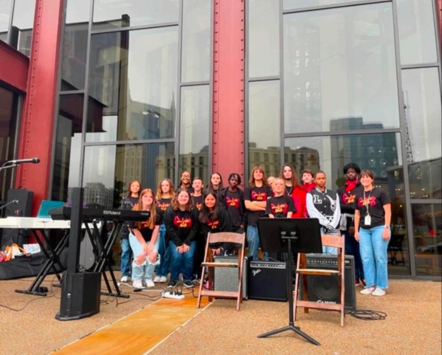 In 2021, the program started out as an after school activity where students with all levels and abilities could come to jam and play music of their choosing. From there, it has blossomed into a full program with three, 45 minute classes during the school day. Everyone and anyone is encouraged to join regardless of their musical abilities and level. Students with more musical experience have the opportunity to audition for the advanced group to further their music education and gain more performance experience. In the advanced class, we have been lucky enough to perform at various events such as the downtown Art Walk, Artsville Fest, and venues such as Wicked Good Sandwiches! Our set lists include all genres of music such as pop, rock, funk, latin, and include bands such as Nirvana, Foo Fighters, Santana, The Beatles, Lady Gaga, Metallica and more.