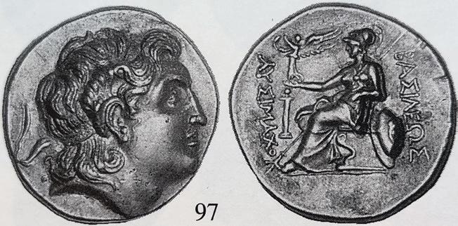 Athena enthroned left, holding Nike crowning Lysimachus’ name, herm in left field.