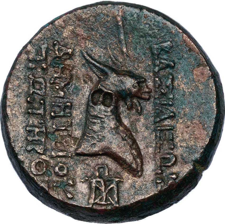 Obv. Head of Heracles right, wearing lion skin, the face with stylized features recalling those of Mithridates VI of Pontus. Rev. ΒΑΣΙΛΕΩΣ ΑΛΕΞΑΝΔΡΟΥ, Zeus enthroned left, holding scepter and eagle, ΘE in left field, ΟΔΗ monogram under throne.