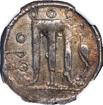 Obv. (K)PO, elaborate tripod, legs decorated by long volute ornaments and lion’s feet, heron facing left in right field. Rev. Incuse tripod, ornamentation in relief.