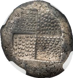 Obv. Ithyphallic satyr abducting nymph and cradling her in his lap. Rev. Quadripartite incuse square. Le Rider, Thasiennes, 8; HGC 6, 336.