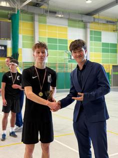 Maciej Reysowski (przewodniczący Samorządu Uczniowskiego) wręczający Adamowi Maliszewskiemu statuetkę dla najlepszego strzelca turnieju