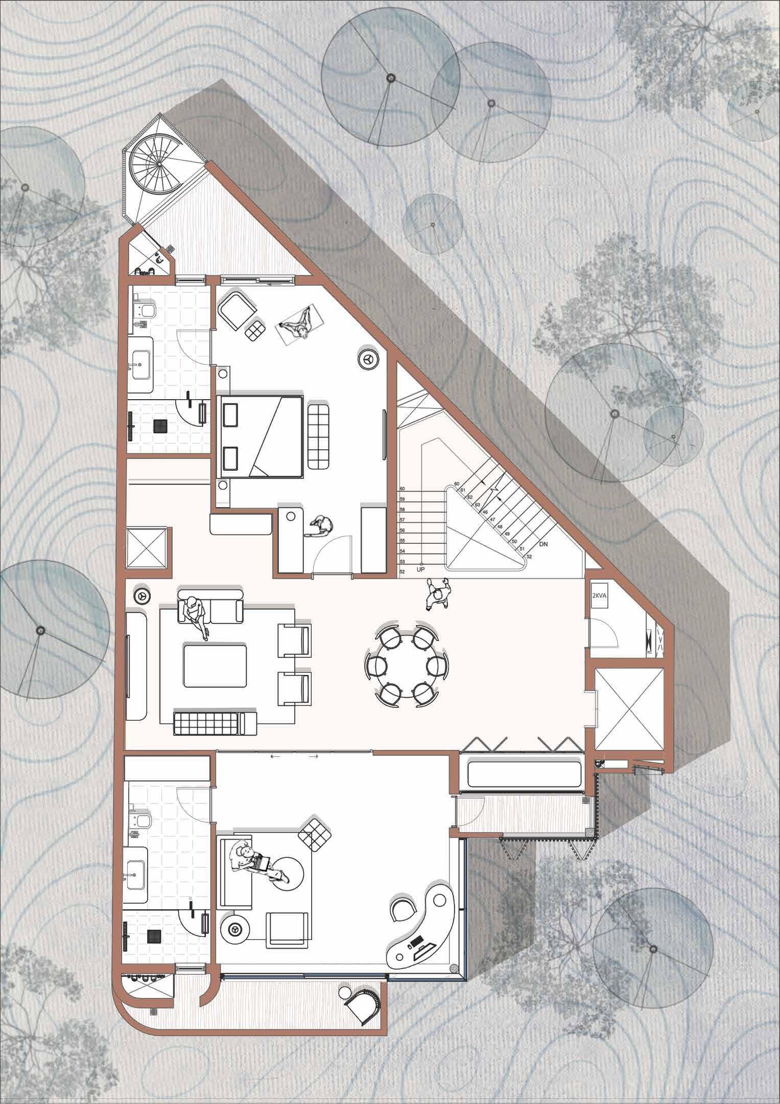 This architectural project with its forest surrounding, features a parametric metal screen for shading and aesthetic appeal. The glass cube bedroom offers unparalleled views of the forest, while the open-plan integrates innovation with nature creating a serene retreat that aspires and rejuvenates.