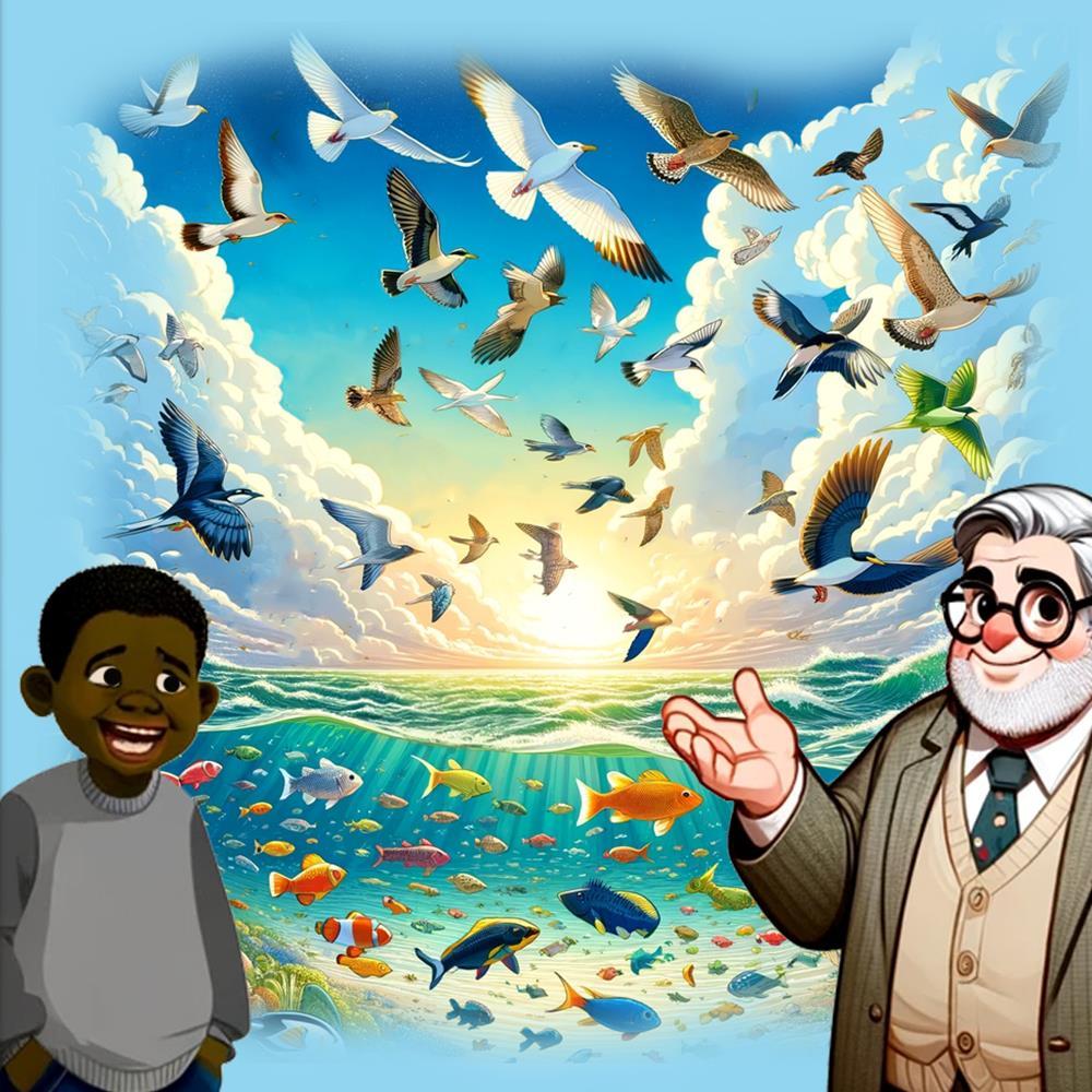 "Birds in the sky and creatures in the sea were next," Mr. Johnson gestures like a bird. "How many creatures did God make?" asks Noah. "Countless, each unique and wonderful," Mr. Johnson answers.