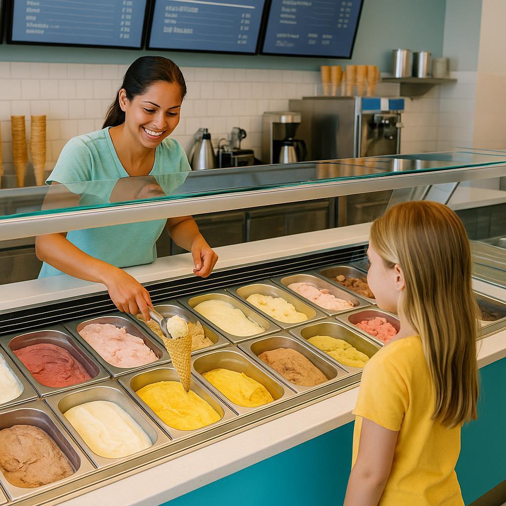 Can you look and learn and tell me the name of the place? You’re right — it’s an ICE CREAM SHOP! Scoops, cones, sprinkles, and syrup — yum! You can choose your favorite flavor.