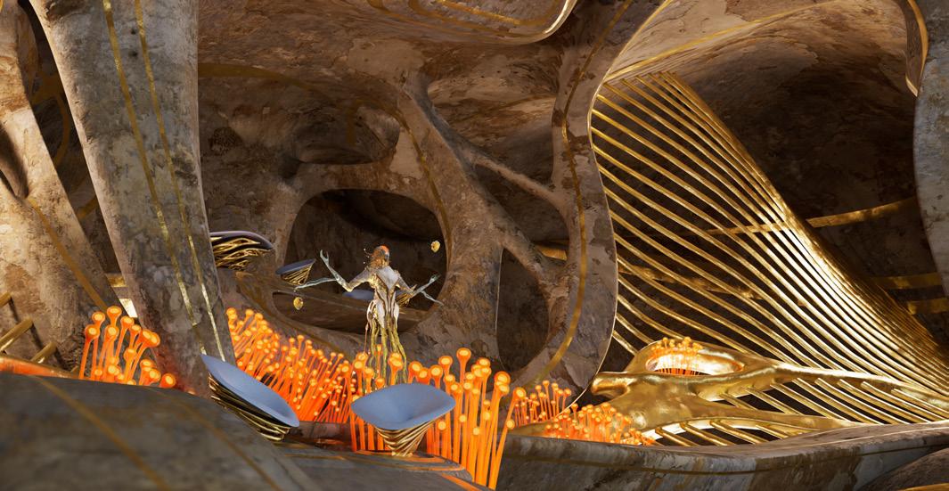 Emphasis was placed on selecting materials and textures that complement the prosthesis’ bone-like composition. Golden swirl bioluminescent material was incorporated against the earth-like exterior of the corpuscle, creating a harmonious blend of organic and artificial elements.
