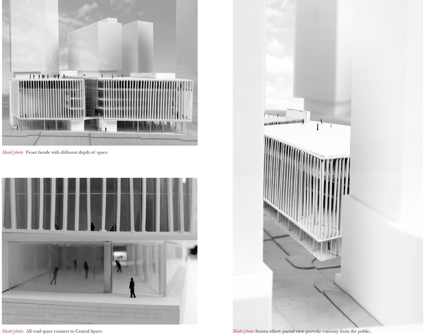 A veil screen wraps around the exterior and interior, defining different program areas. At key points, the curtain wall is pulled back to create spatial depth and a welcoming void that draws public attention. The screen spatially separates but acoustically connects programs, generating curiosity. From the exterior, users see only partial views; upon entering the central space, they experience the full complexity of the design.
