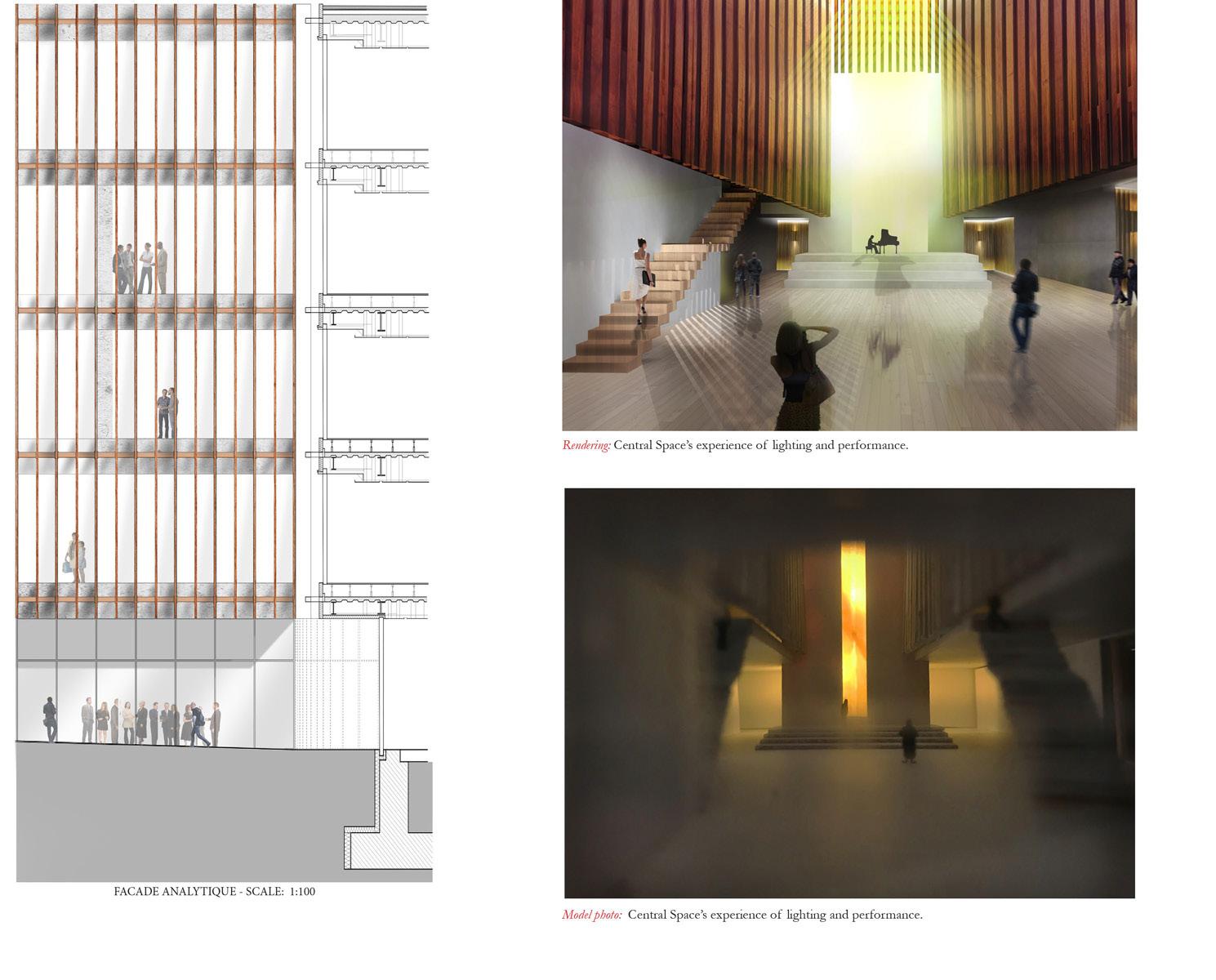 The design centers on a central space that regulates the two performance areas and mirrors the programs. Each performance space connects to the cityscape or the metro green line. Vertical elements throughout the project emphasize theatrical lighting and spatial connections.