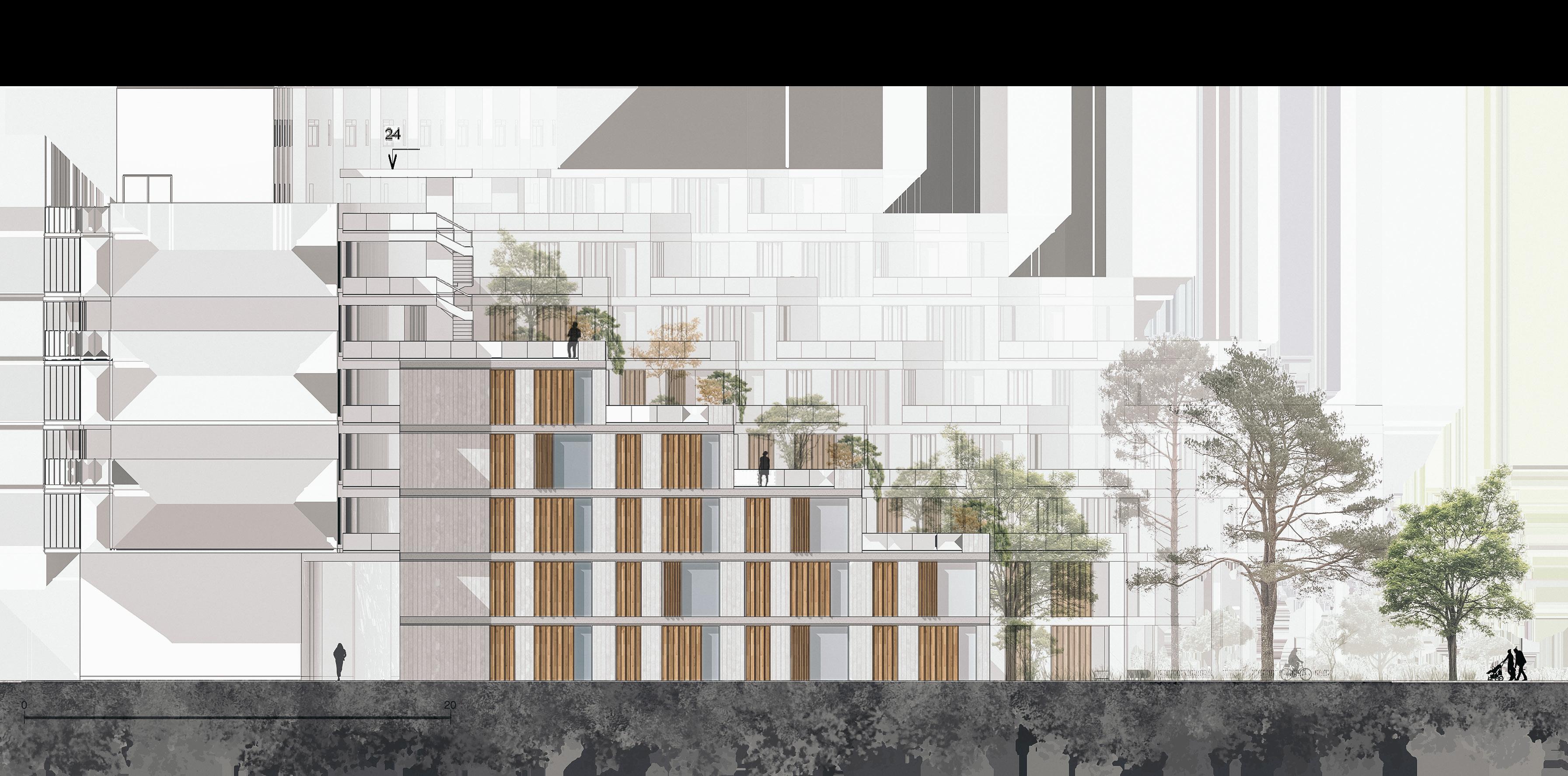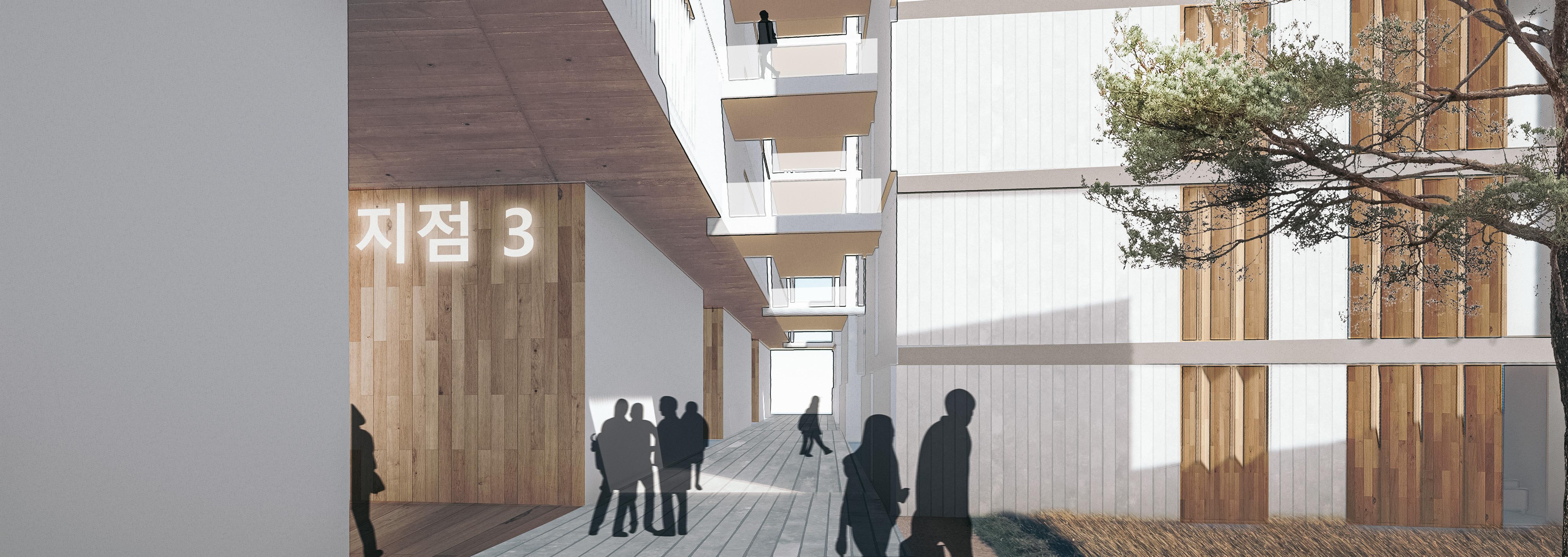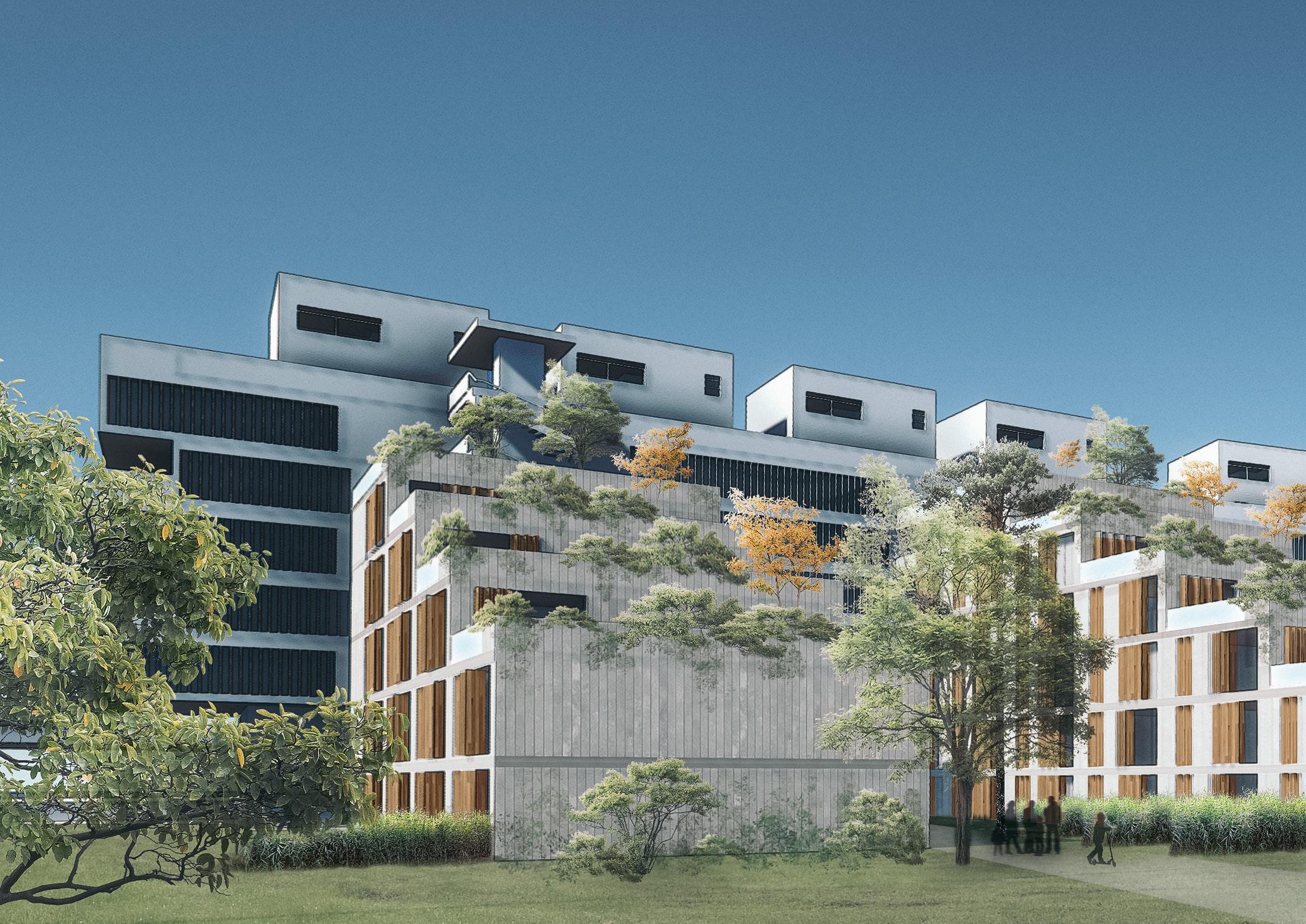 As a part of the international student ex change I took part in during the 2021 spring semester, I worked with a korean teammate on a residential project. The site is located near a highway so it was primordial to reduce the environmental noise levels. The building was separated between us, the tallest vo lume being used as a noise buffer for the residential terraces located further back which was the part that I designed.