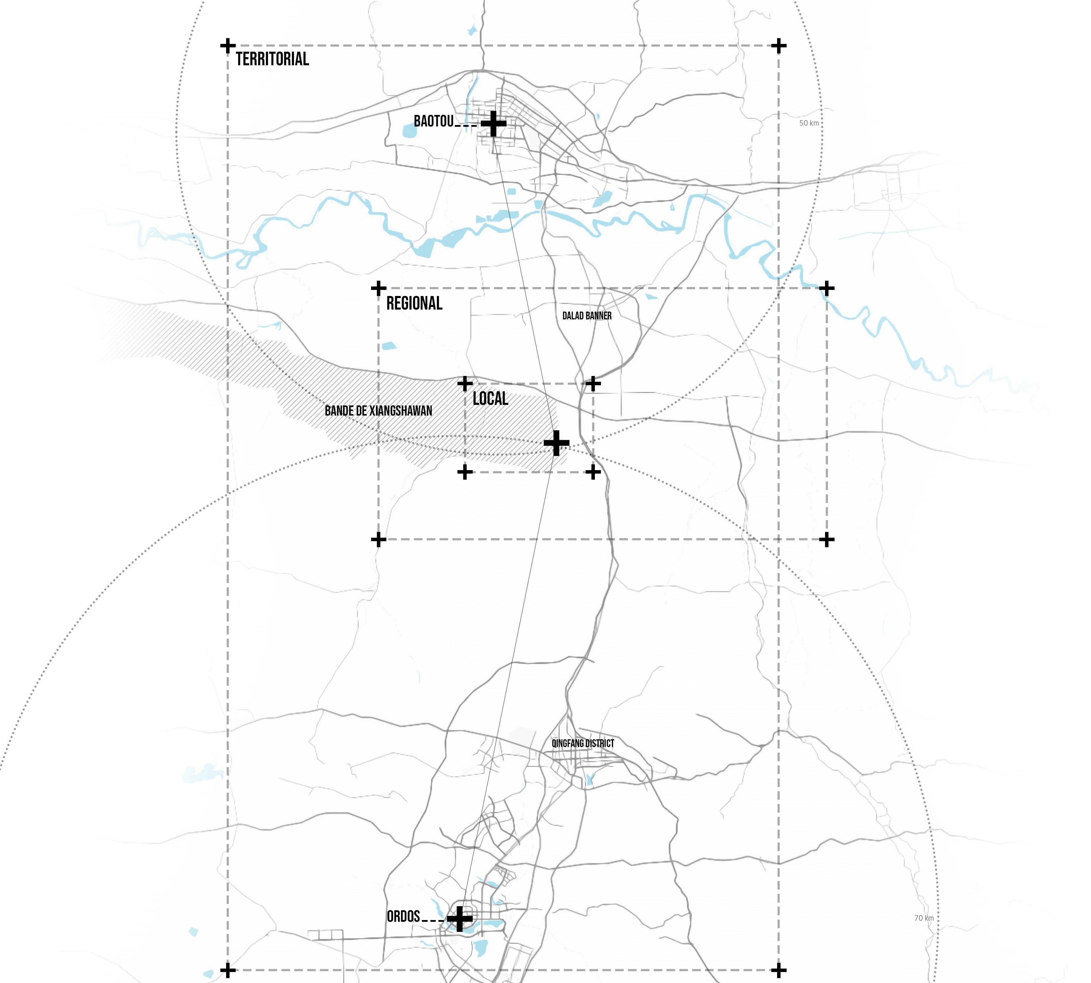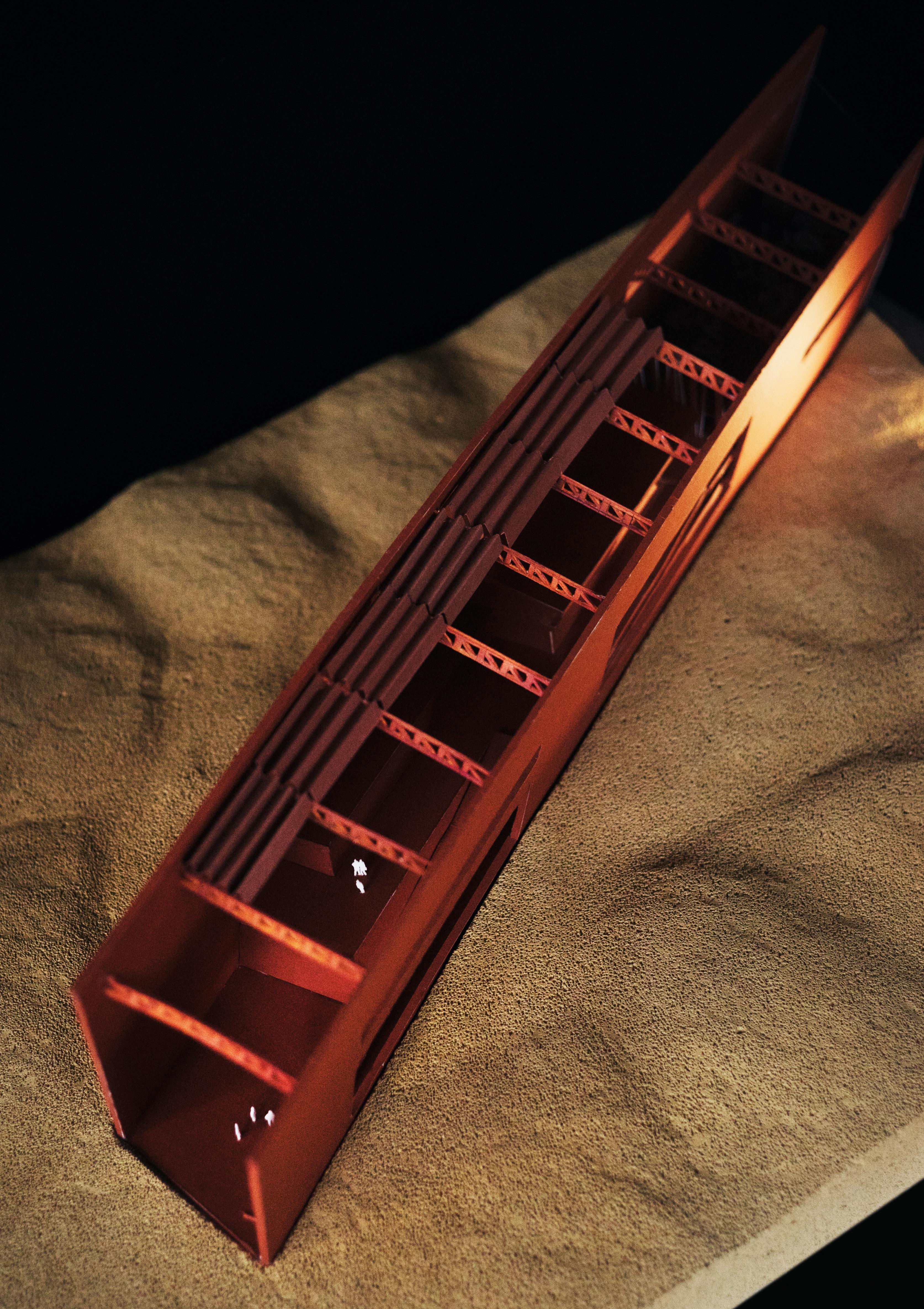 The desertification of the soil is an existential threat for the chinese territory and the rest of the world. Every year, more than 12 million hectares of fertile land are lost to the relentless progression of the desert. In Inner Mongolia, only a few natural barriers remain to contain the desert expansion. But most of these forests are now too weak to stop the desert on their own. Located at the top of the dune that threatens the forest below, the building deflects the progression of this part of the desert. The shape of the reclaimed steel structure is calibrated to redirect the path of the wind and thus preserve the natural barrier while it regenerates.