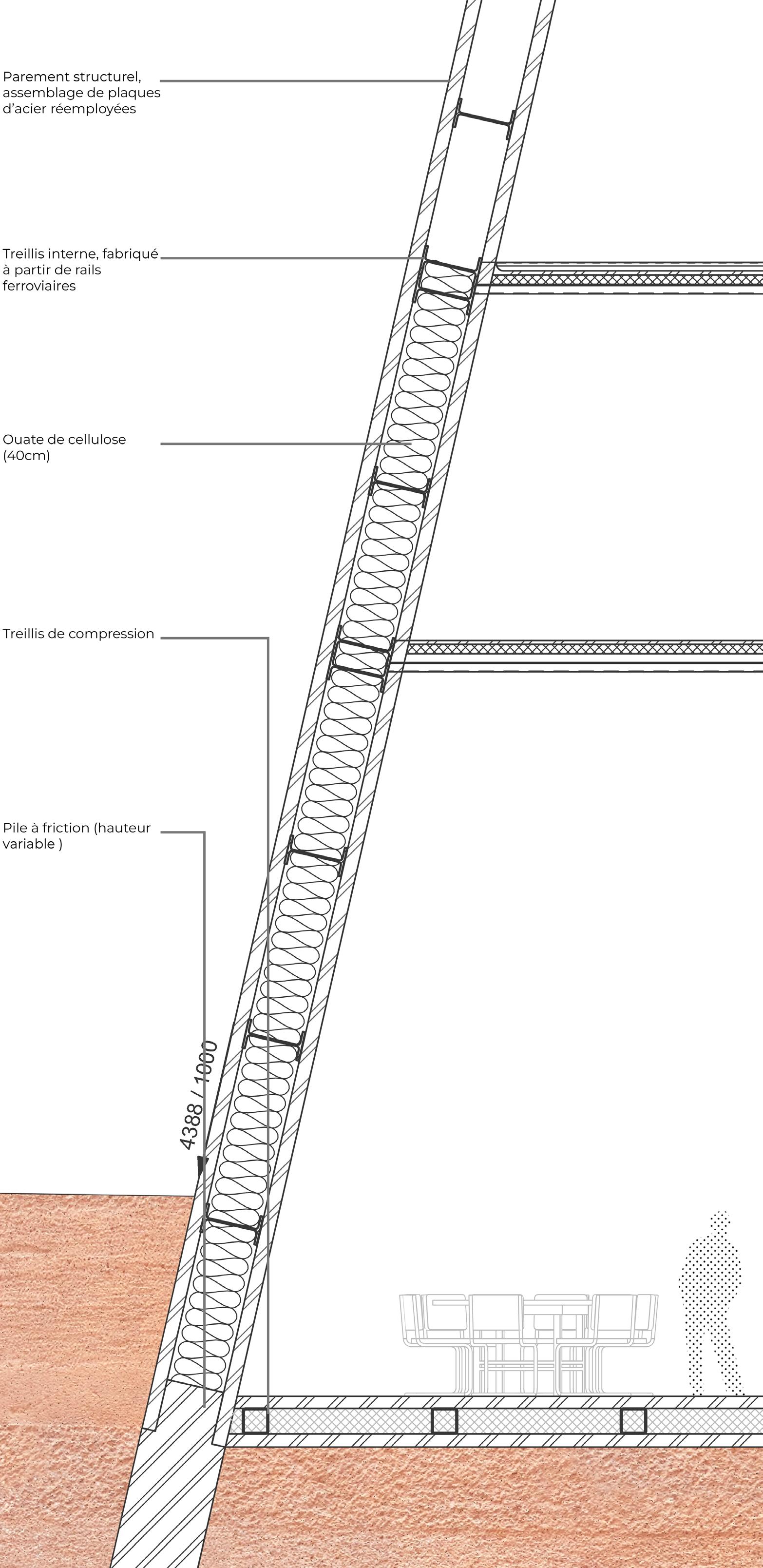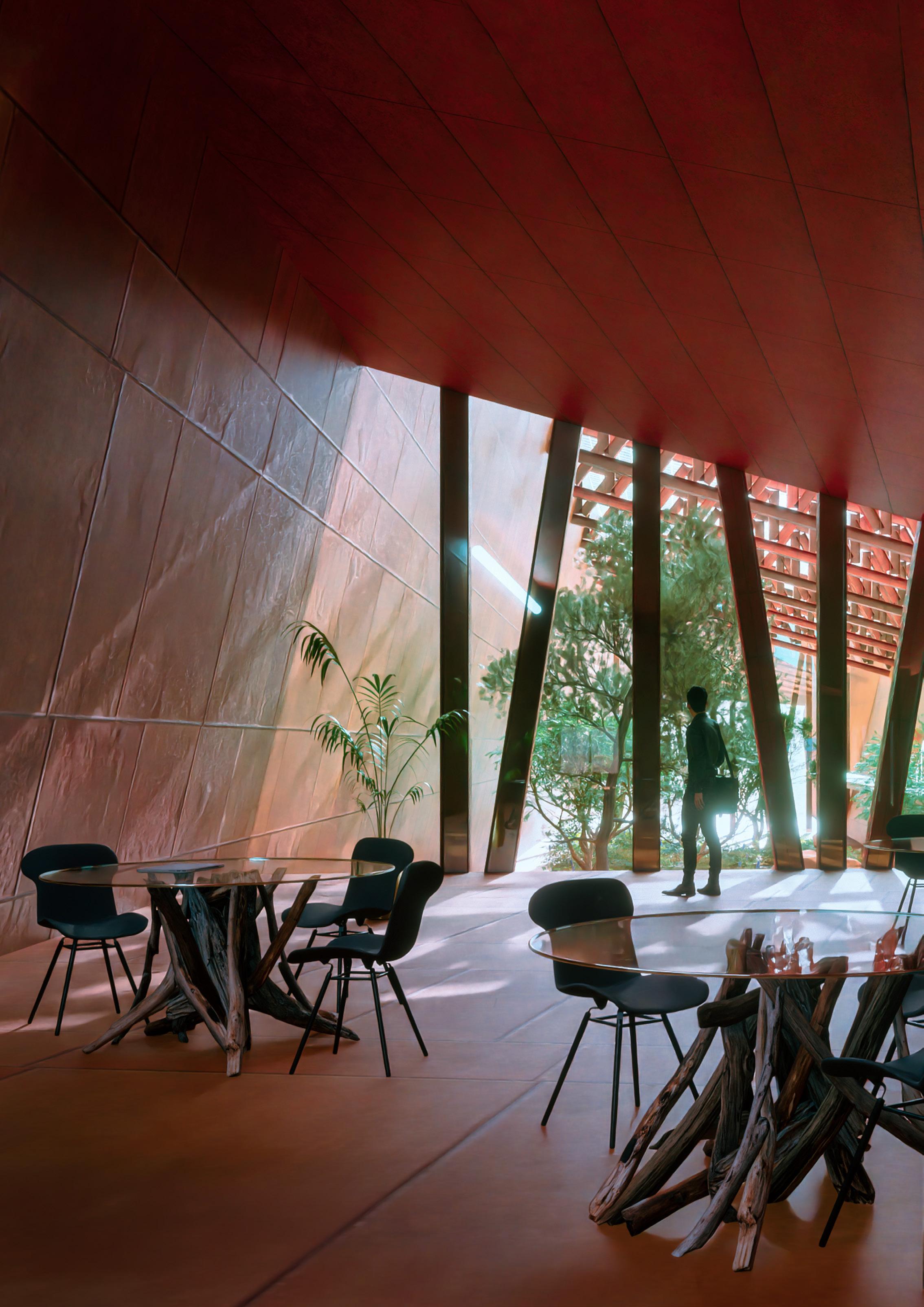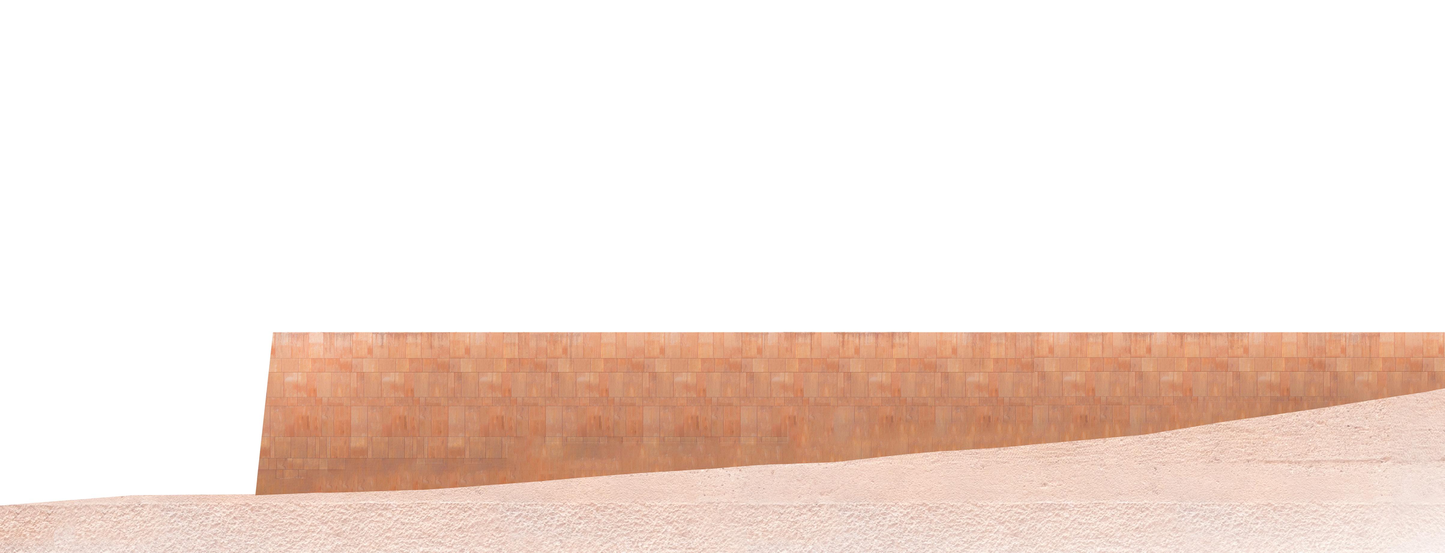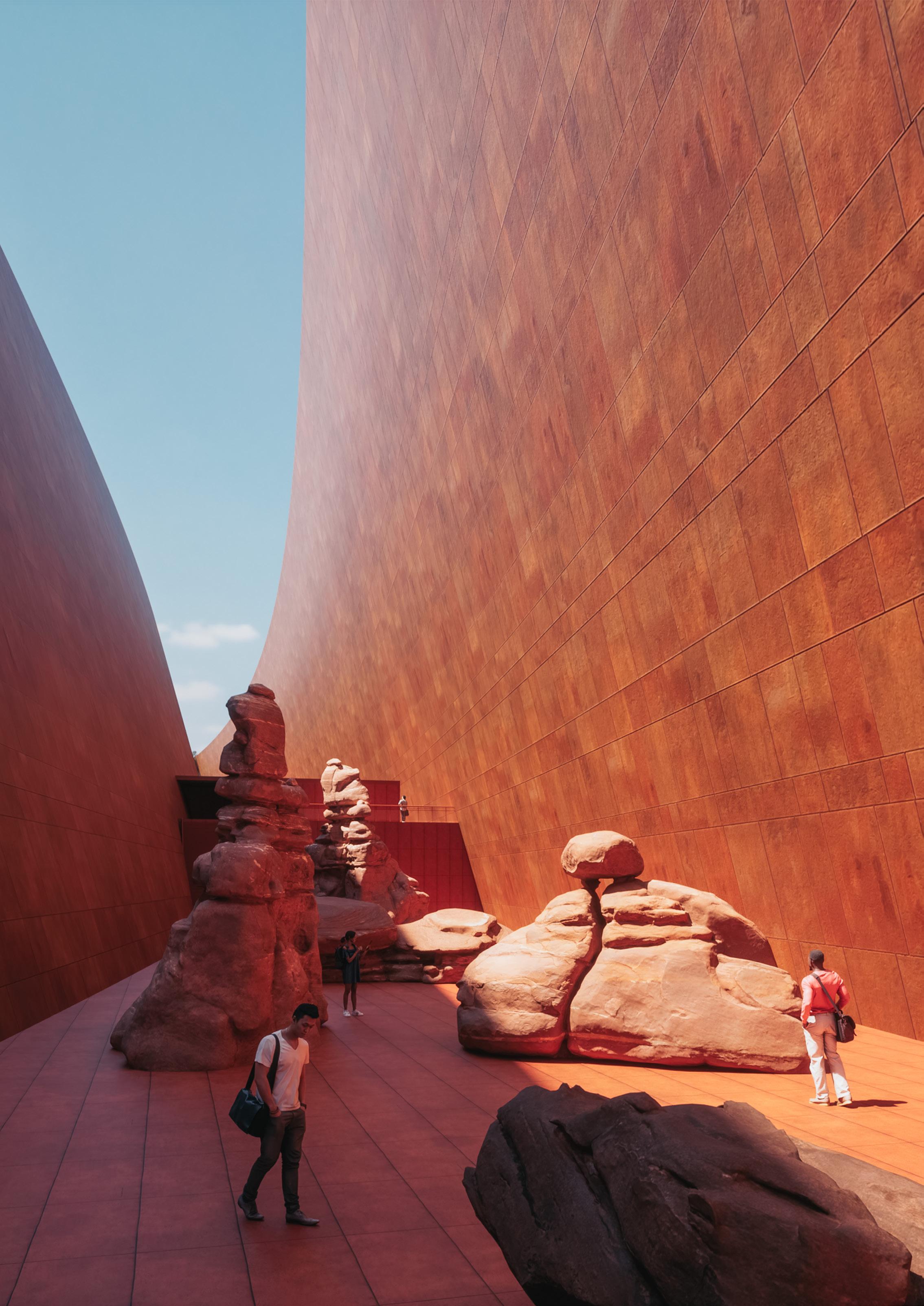 On the first two levels there is a semi-modular space dedicated to cultural activities. Then, following the path to the summit, the vi sitor discovers the facets of the desert environment by geological strata, starting with the soil, water, life... until the summit. The pro gression along this route is directly felt by the fact that the walls progressively lower the closer the visitor gets to the experimental forest at the top