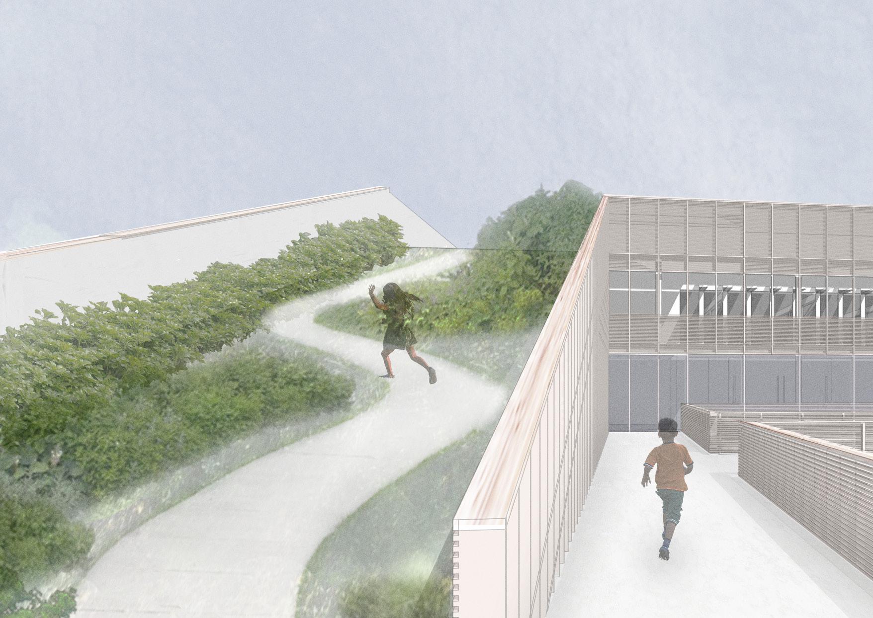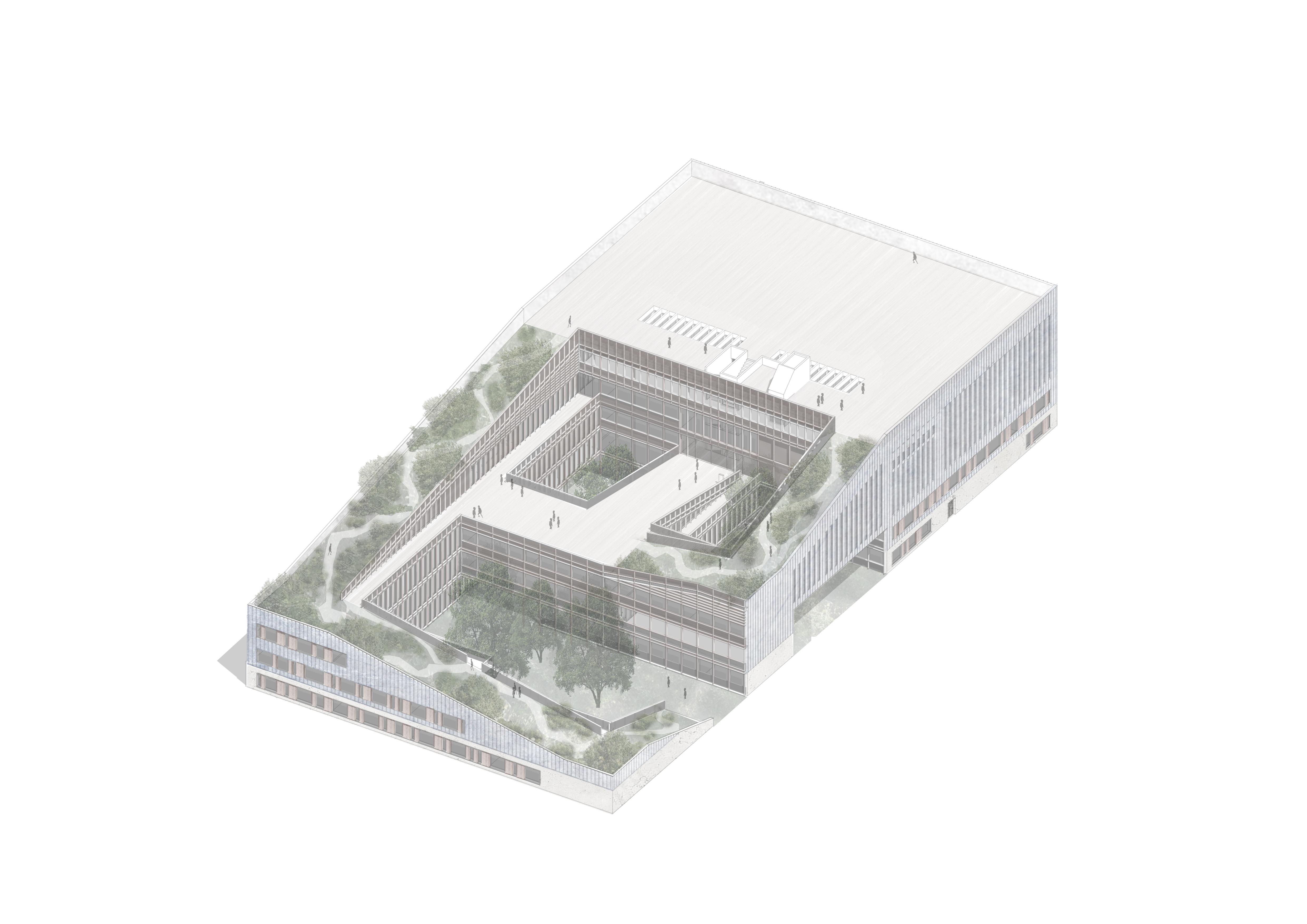 The very dense project requirements forced us to build a massive structure. However the team decided on having one rule for this entire project : we need to have at least 1000m² of unobstructed soil once the building is complete. This allowed us to stay away from the easy route of box-like behemoths and helped us to come up with a lighter design while maintaining the original project requirements.