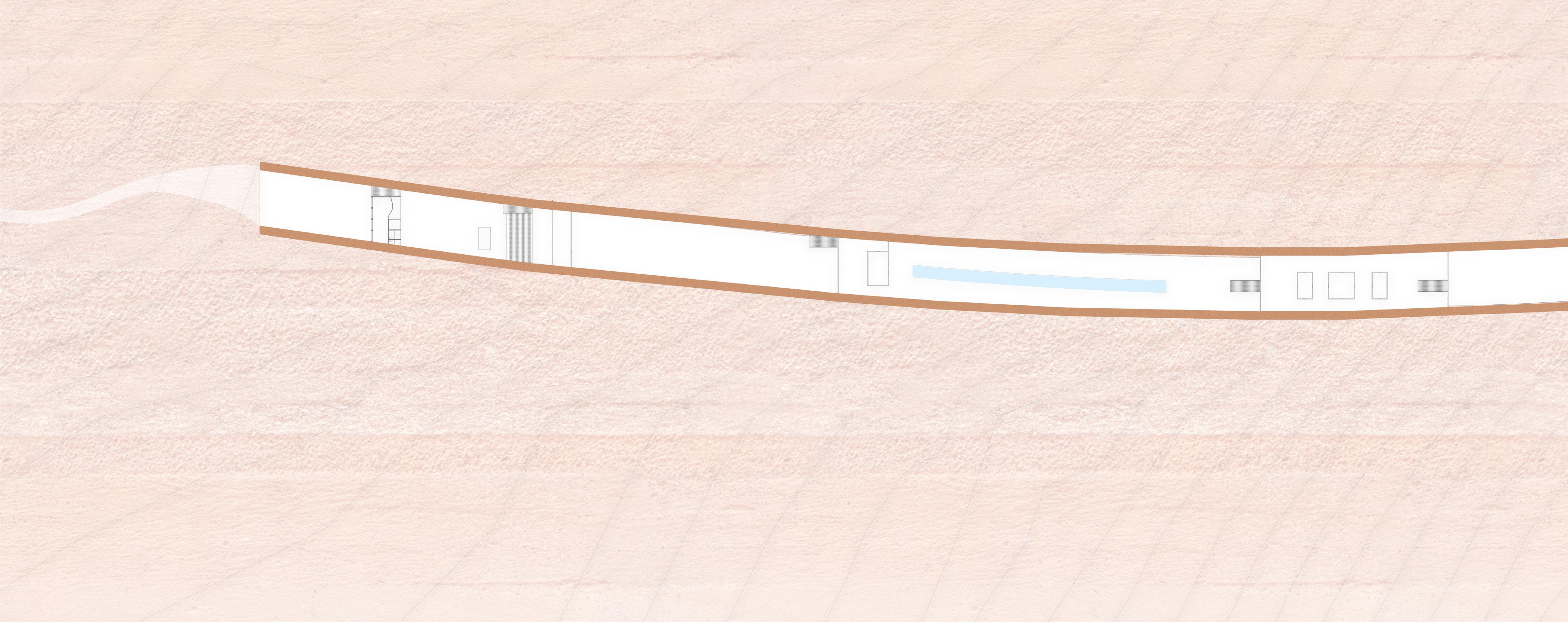 The interior layout follows the topography of the site. Entering the building from one of the two ends, one discovers an ascending path that ends at the top of the dune. Two programs cohabit wit hin the same structure: the in-situ research center spreads over three levels, separating the two poles of geology and biology. Starting at the opposite end, the interpretation center represents the connection to the tourist activity already present on the site.