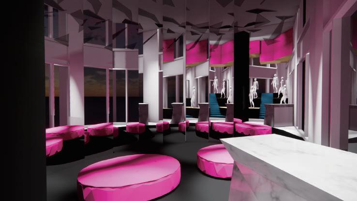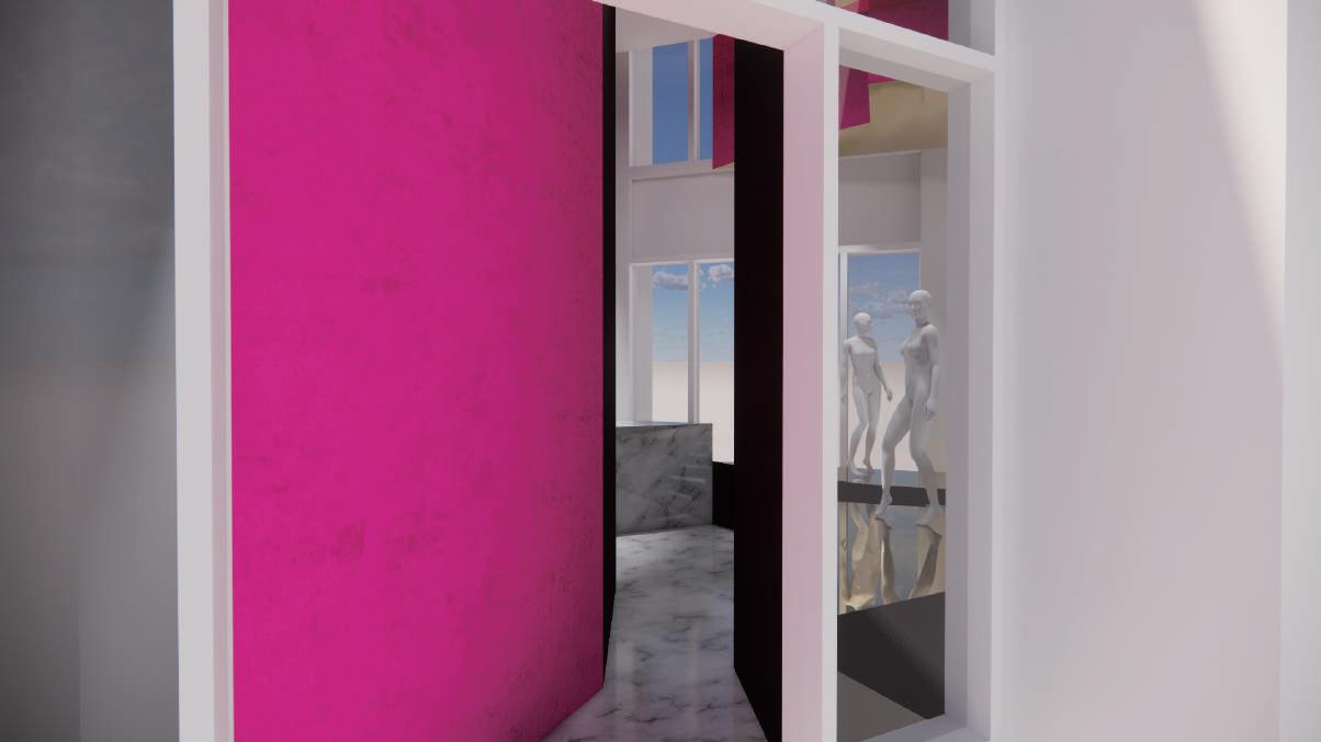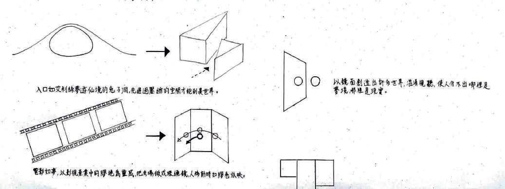 把入口處縮窄,讓顧客進入商店時有一個從現實世界 進入夢境時的過度空間,先擠壓再放鬆。靈感來源於 愛麗絲夢遊仙境,愛麗絲掉進兔子洞時也是如此。