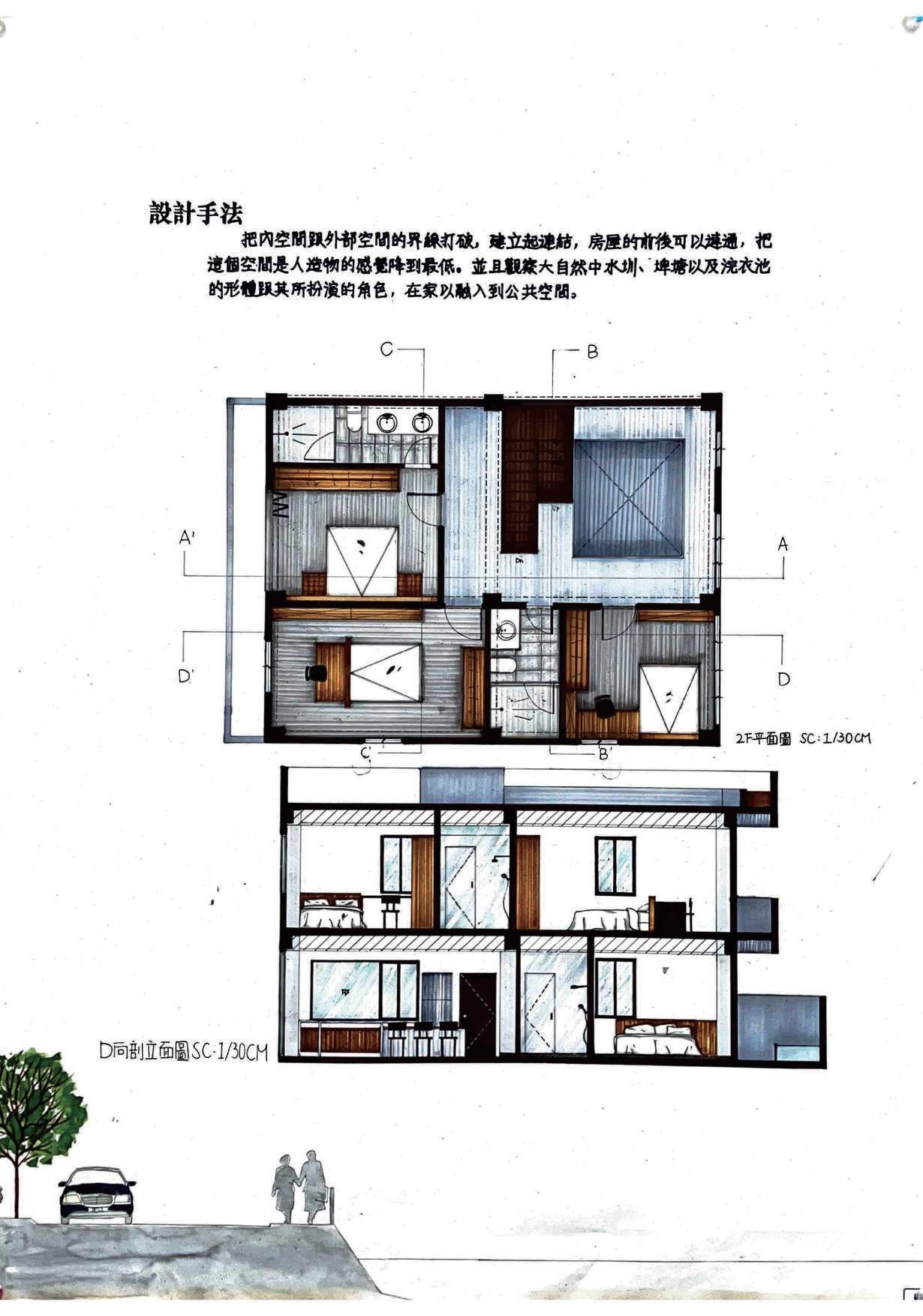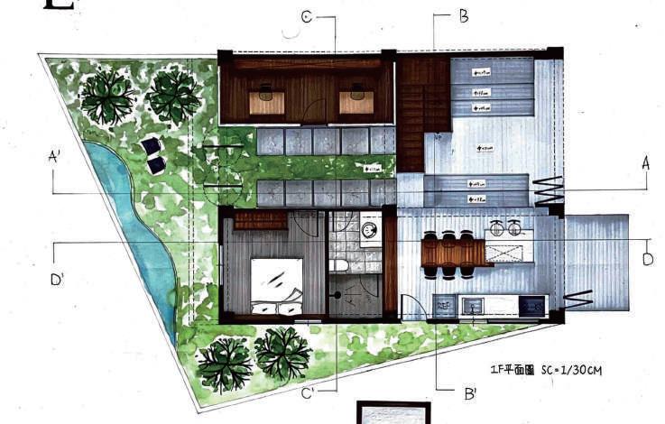 把內部空間跟外部空間的界線打破,建立起連結,房屋的前後可以連通, 把這個空間是人造物的感覺降到最低。並且觀察大自然中的水圳、埤塘以 及浣衣池的形體及其所扮演的角色,讓人在家也能夠親近大自然。