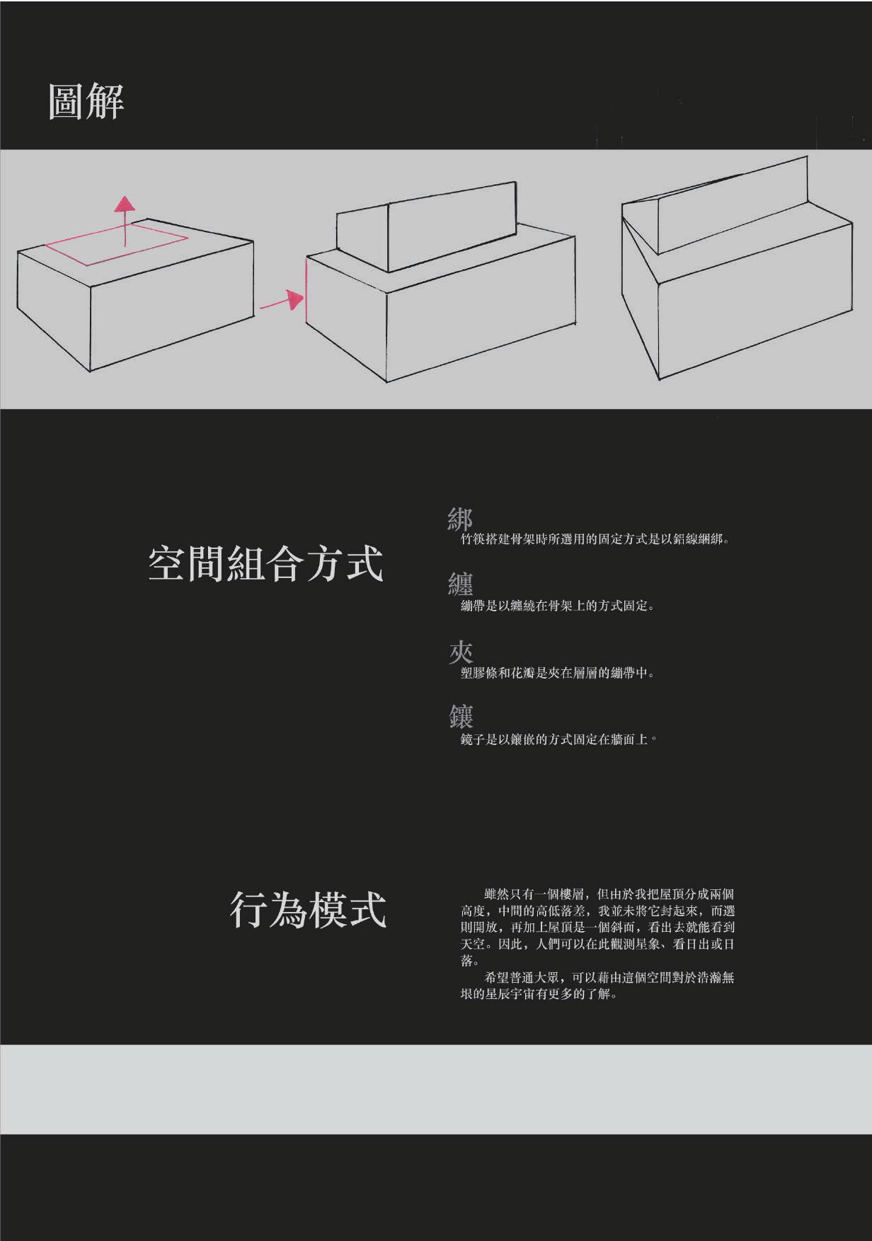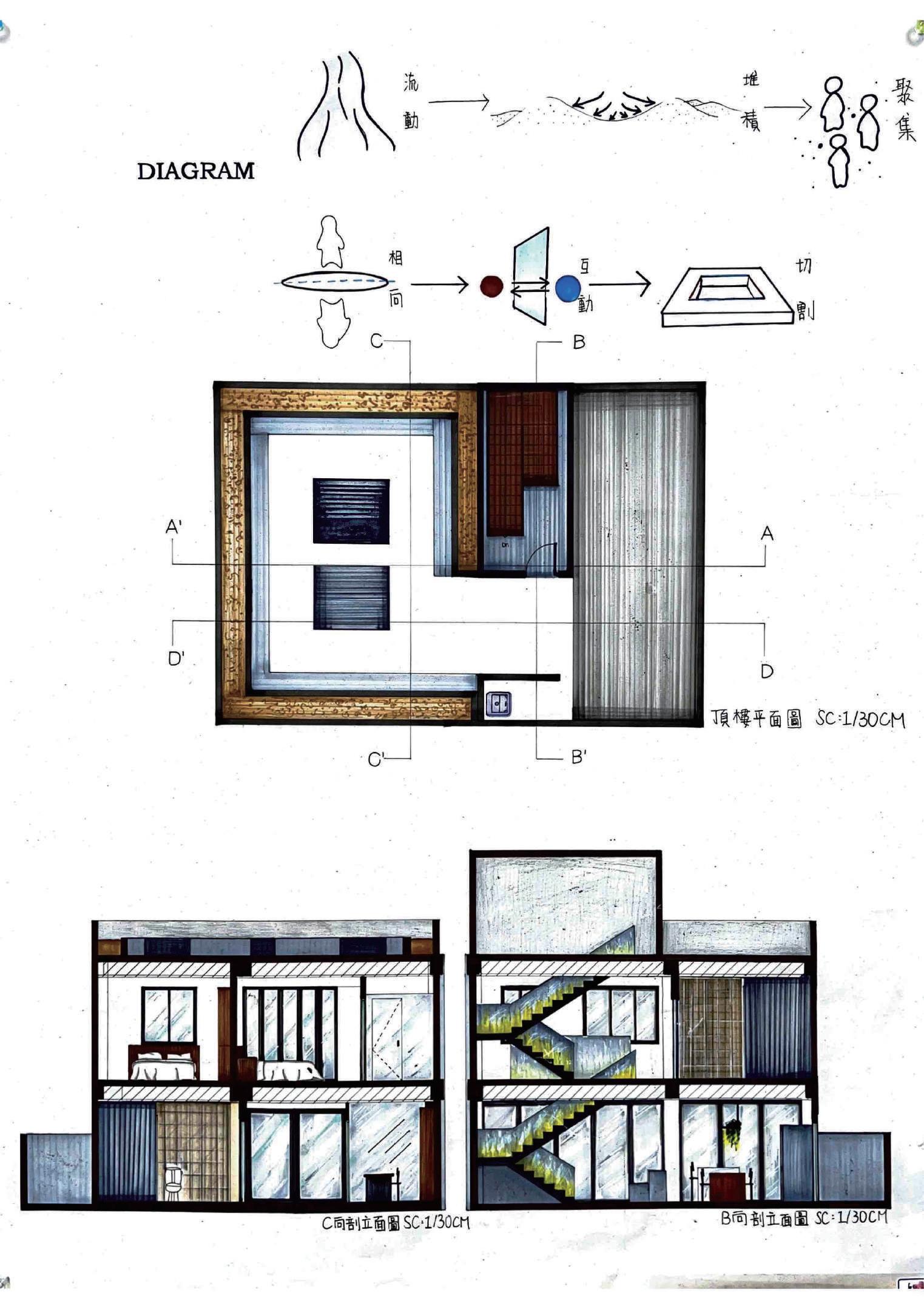 人類的交流有時是以大自然作為橋樑, 但隨著工商業的發展,人類以自然為媒 介而交流的行為變得越來越少,創造出 空間是想回到初始。把空間融入到周遭 的自然環境,進而讓使用者在空間中交 流時感受到自然。
