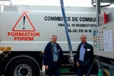 Twee instructeurs van FOREM poseren bij de opleidingstankwagen en de vaste laad- en losinstallatie van het Sociaal Fonds in Mornimont.