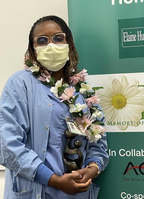 Elaine Hume-Dawson, recipient of the Daisy Nurse Leader Award, in the Healing Garden next to the Healer’s Touch statue that symbolizes the