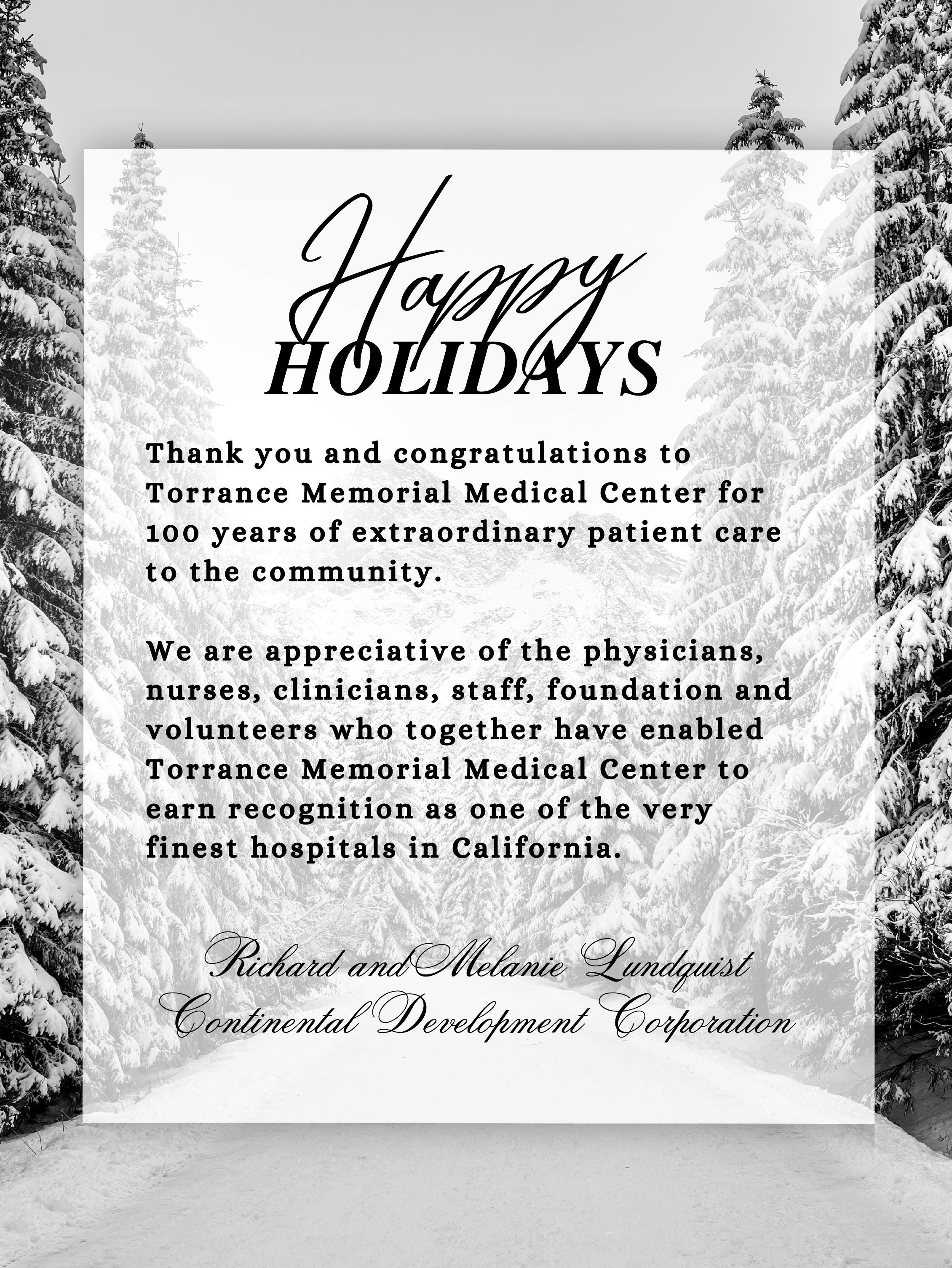 This year marks a very special milestone—Torrance Memorial’s 100th anniversary, as well as my 25th annual Holiday Festival. We look forward to this cherished time of year as it kicks off the holiday season with our beloved Holiday Festival.