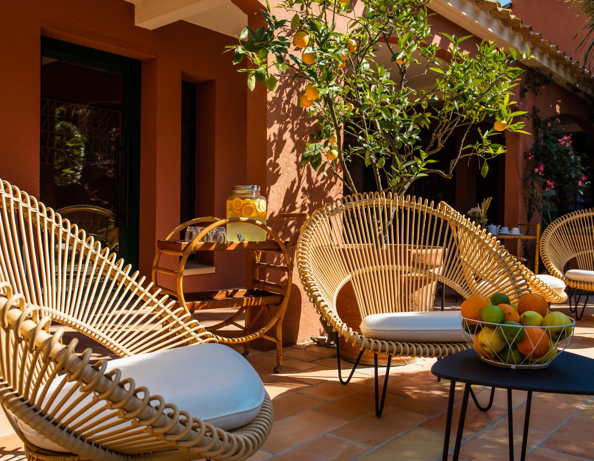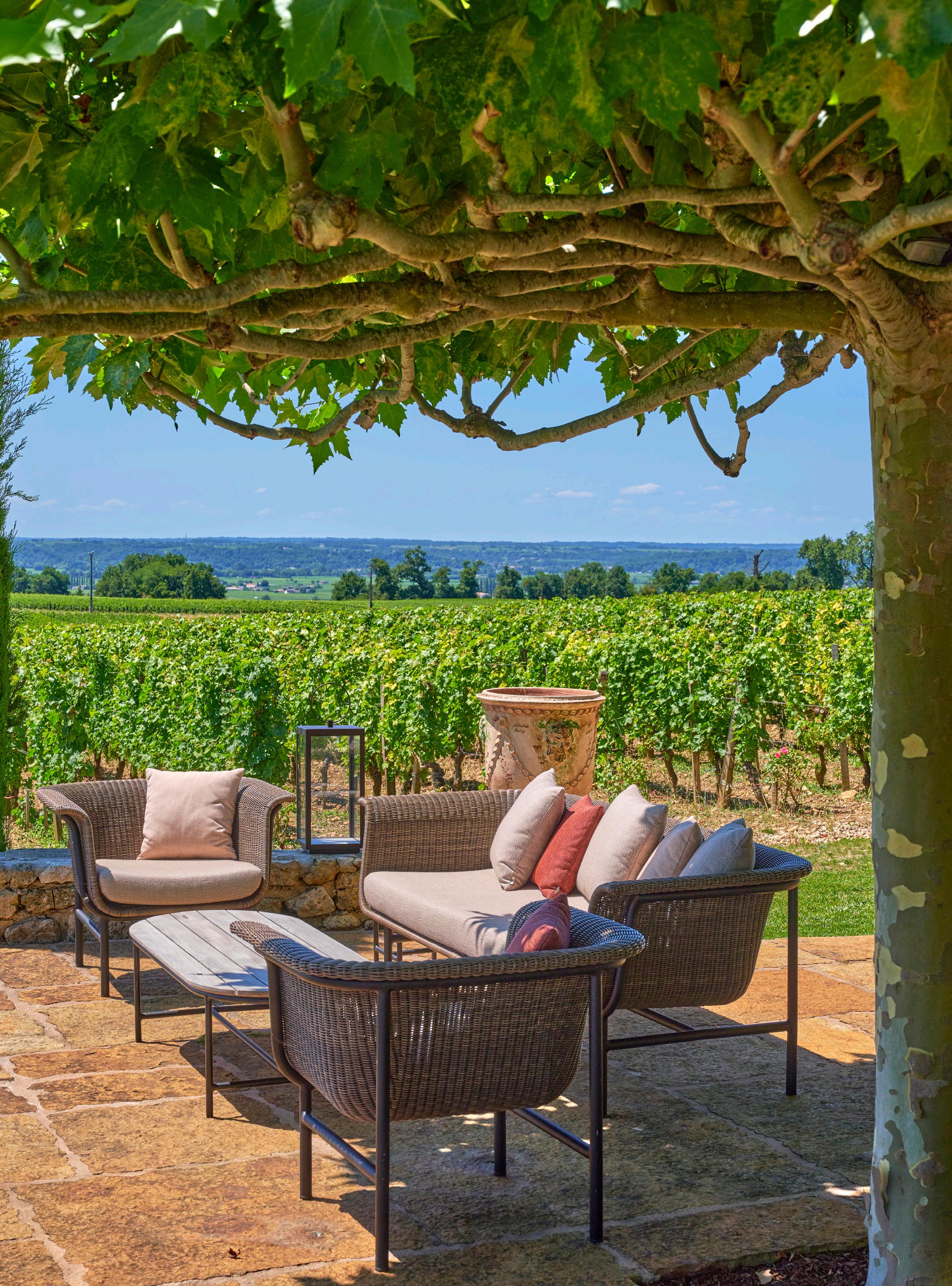 The estate features a stunning outdoor terrace amidst the vineyards. Enjoy a snack or a drink in a Wicked lounge chair experience this unusual terroir.
