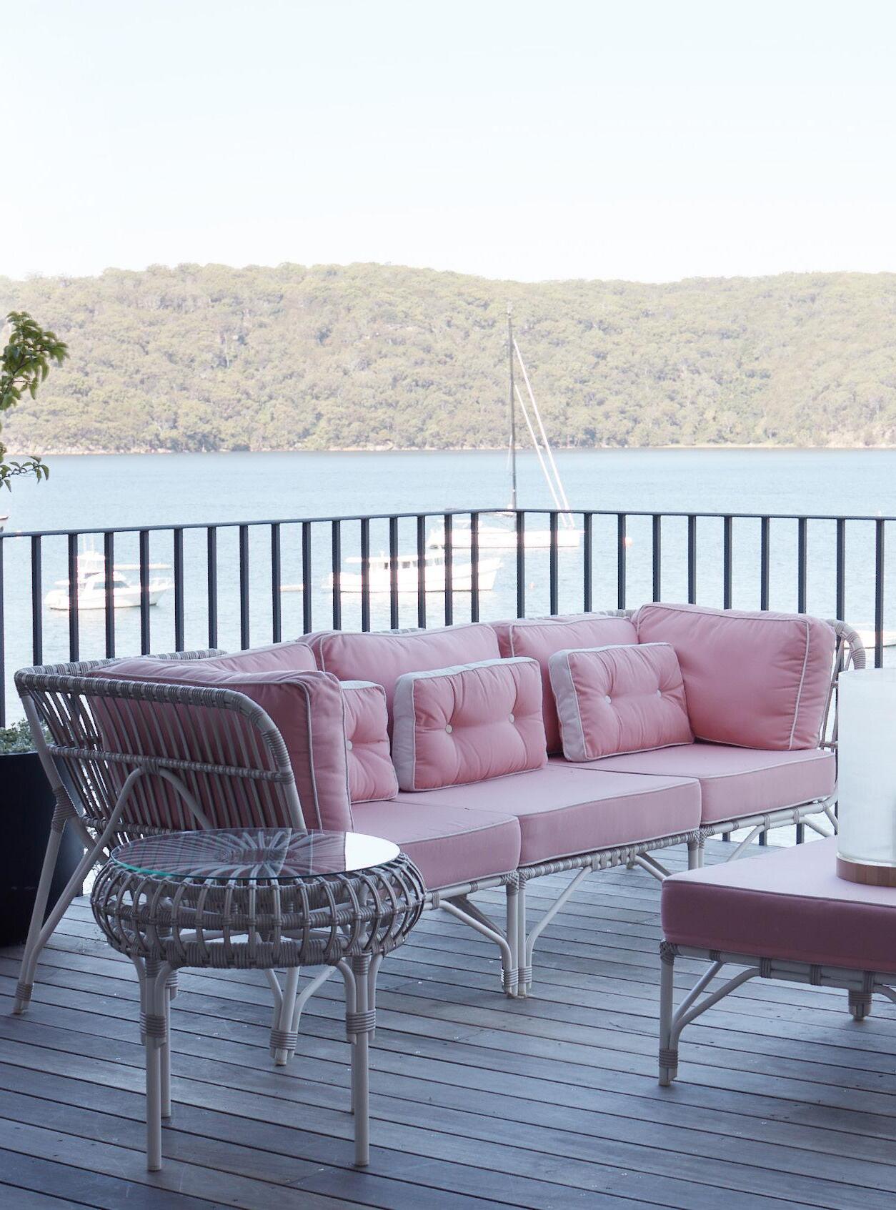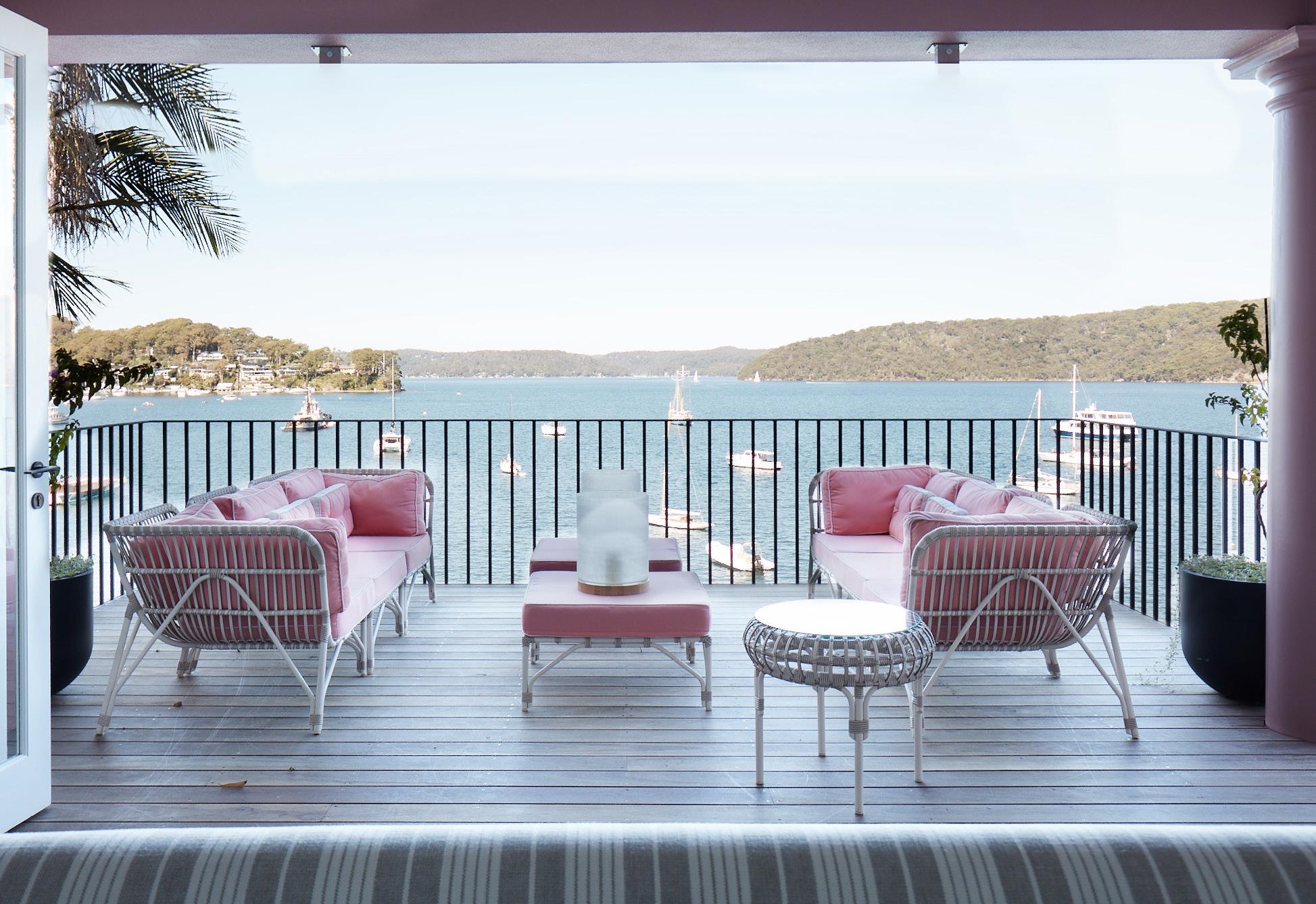 Colour defined the outdoor spaces, a soft yet striking pink façade contrasting with vast water views and the tranquil expanse of Pittwater. The front terrace offers a vantage point over the bay, an azure pool glistens in the sunlight, and a shaded balcony provides a cool retreat. Each space is designed to capture the changing light from sunrise to sunset.