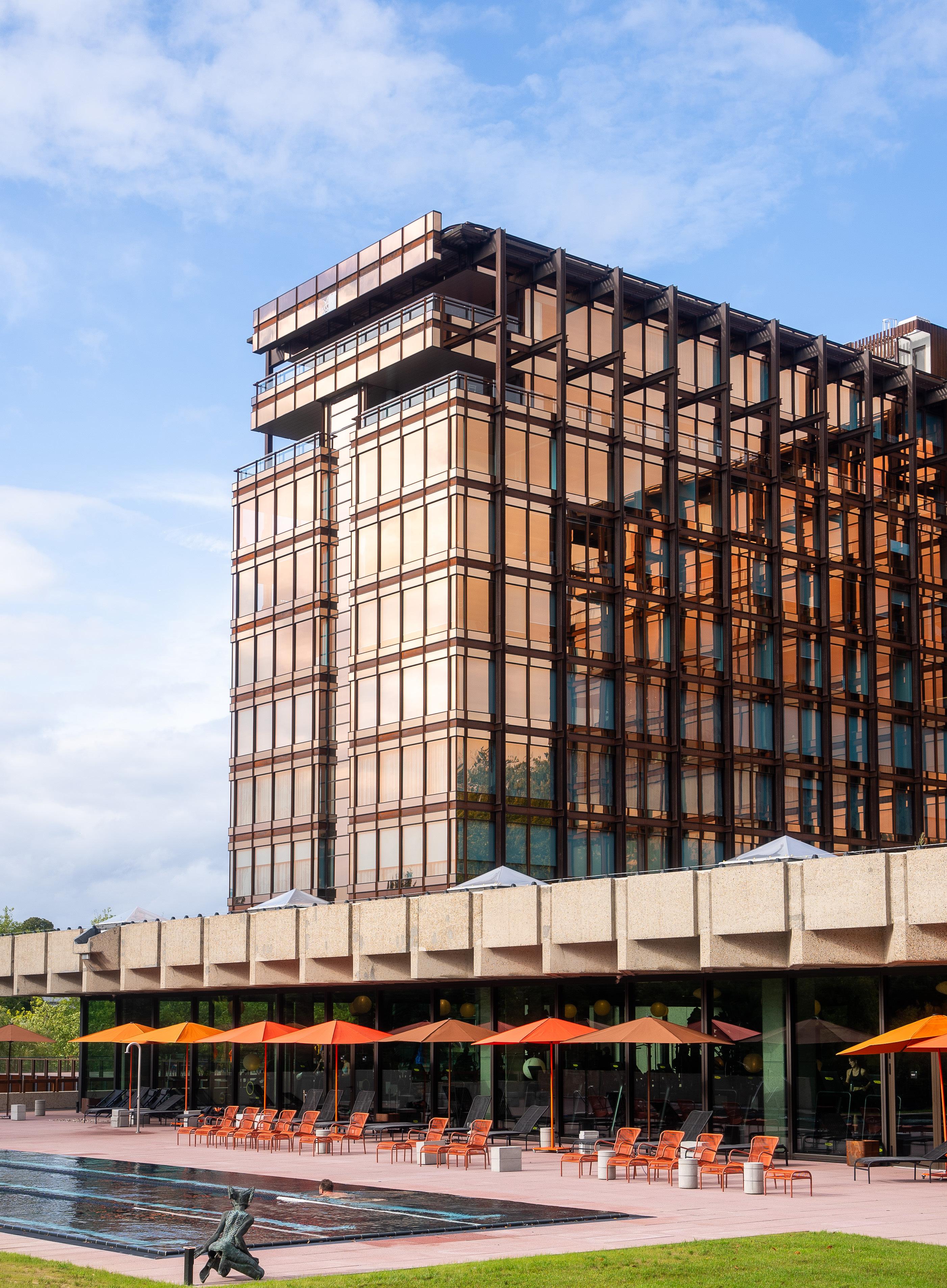 Mix Brussels, located in the iconic Royal Belge building, is a versatile project offering a hotel, restaurant, fitness and wellness center, coworking spaces, and event venues. The cross-shaped building provides panoramic views of the nearby Sonian Forest and is characterized by bronze-colored windows and steel.