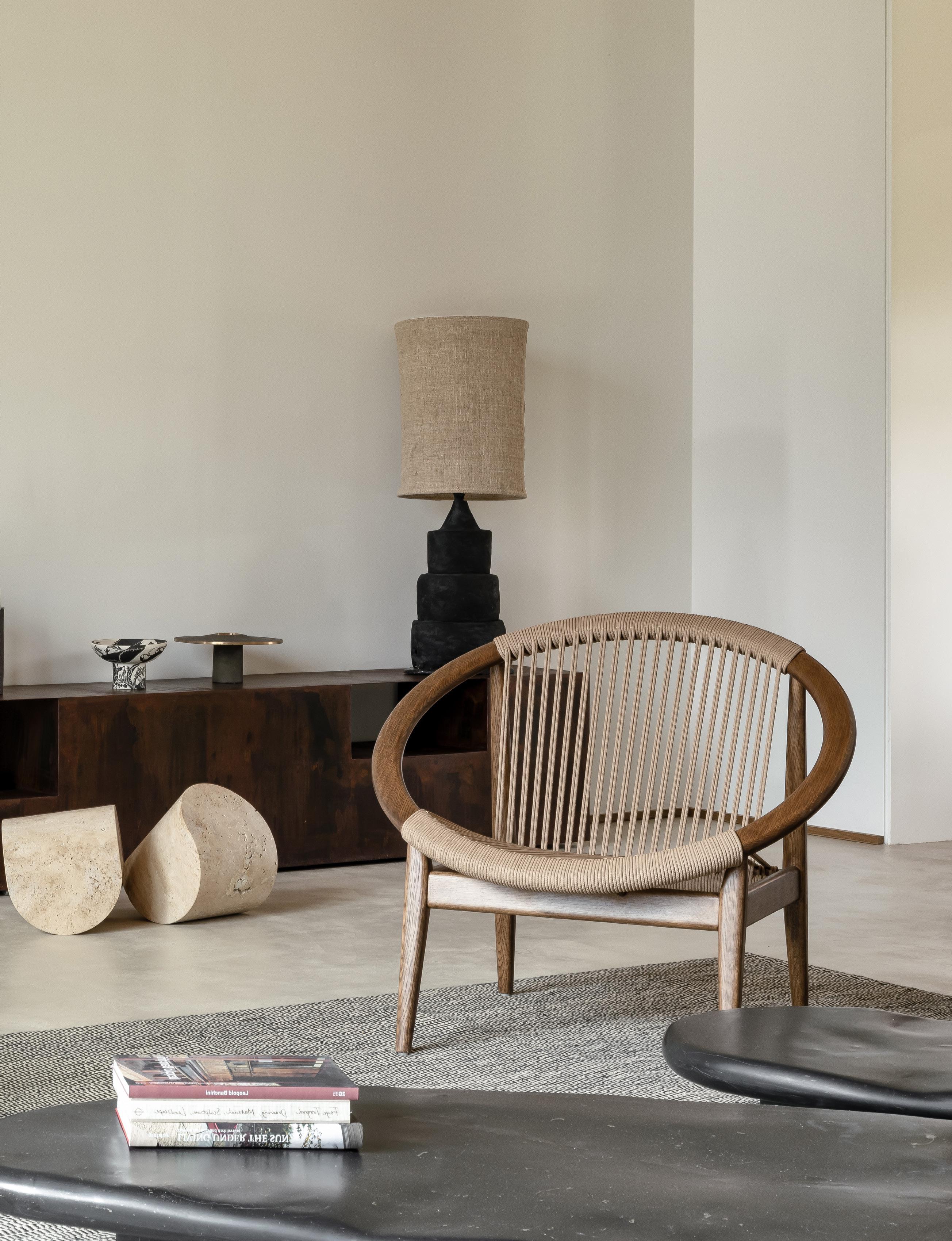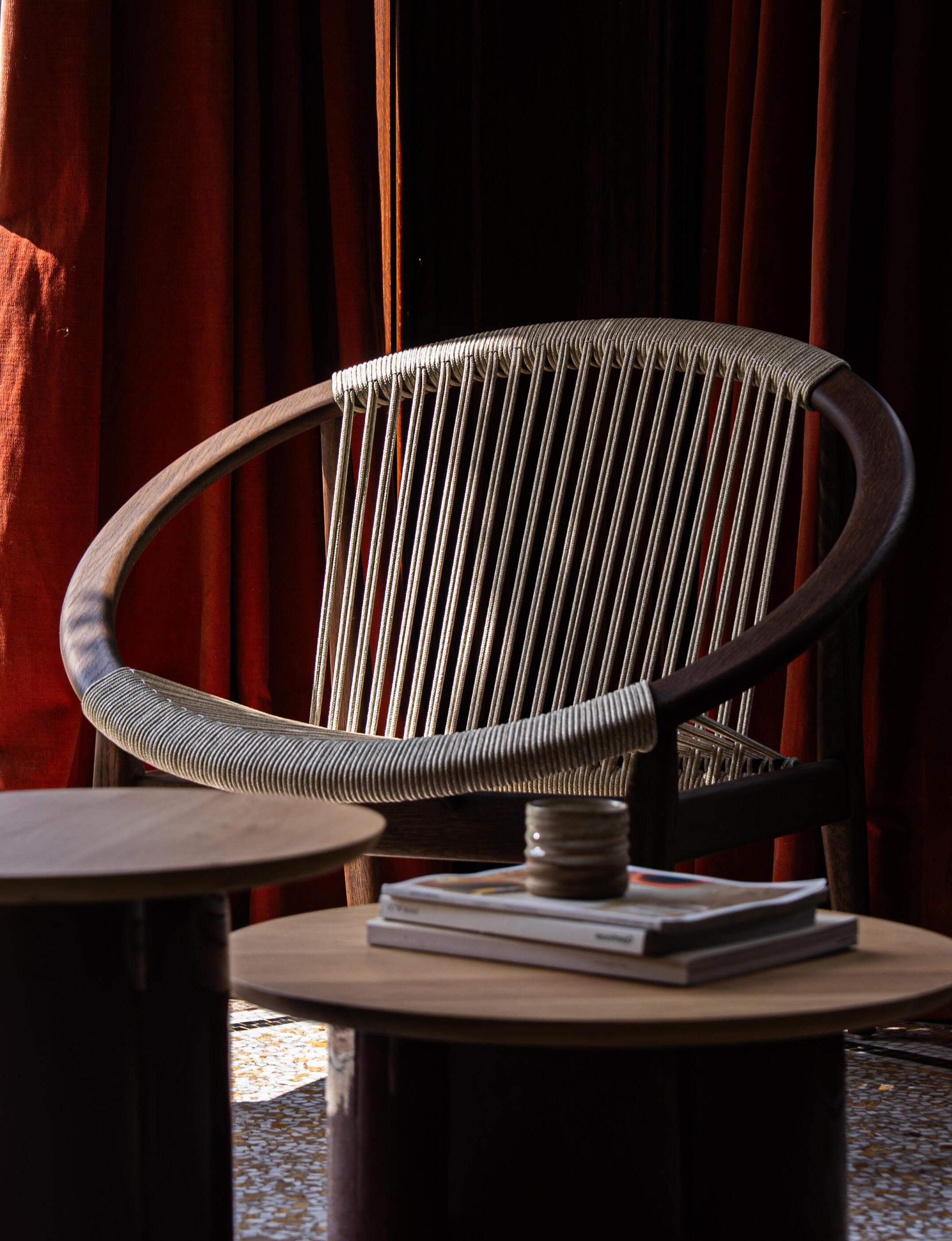 The Norma lounge chair has a distinctive design which unites dark stained oak wood and tactile rope. With its sturdy oak legs and round-shaped frame, it supports a generous seat made of tightly-strung rope.