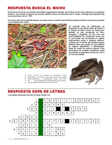 Fotos: Vincent Vos. Fuentes de información: “Rana marmolada” en EcuRed: http://www.ecured.cu/index.php/ Rana_marmolada, y “Leptodacylus elenae” por Kevin Gin: http://amphibiaweb.org/cgi/amphib_query?wheregenus=Leptodactylus&where-species=elenae