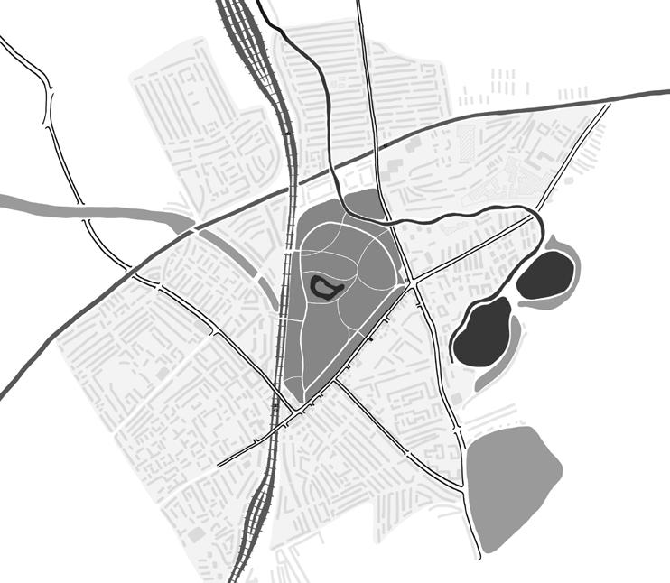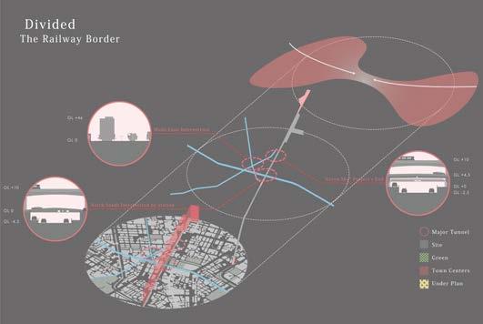 and overpasses, creating an enclave disconnected from its surroundings. The design seeks to extend the vitality of the station area toward the city library, generating a continuous public realm that stitches together circulation and activity. In the School & Junction segment, the goal is to transform the site into an accessible and legible pedestrian corridor particularly for students, allowing the space to become part of their everyday routes and rhythms. Lastly, the Heritage Park segment faces the challenge of being enclosed on three sides by transport infrastructure. Here, improving accessibility is essential, and the adjacent heritage park to the north presents an opportunity to extend cultural and recreational activities into the site and further south.
